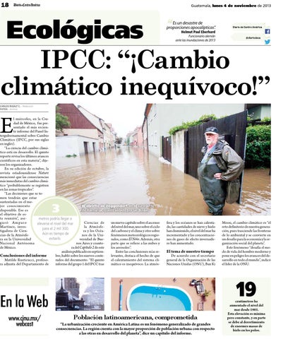 l miércoles, en la Ciudad de México, fue presentado el más reciente informe del Panel Intergubernamental sobre Cambio Climático (IPCC, por sus siglas en inglés). “La ciencia del cambio climático está en desarrollo. El quinto reporte revisa los últimos avances científicos en esta materia”, dijeron los organizadores. En su edición de octubre, la revista estadounidense Nature mencionó que las consecuencias más inmediatas del cambio climático “probablemente se registren en las zonas tropicales”. “Las decisiones que se tomen tendrán que estar sustentadas en el meEl distrito de Deggendorf, en el suroriente jor conocimiento de Alemania, quedó aislado por las lluvias. disponible. Ese es el objetivo de esta reunión”, asemetros podría llegar a Ciencias de un nuevo capítulo sobre el ascenso g u ró A m pa ro elevarse el nivel del mar la Atmósfedel nivel del mar, uno sobre el ciclo Martínez, invespara el 2 mil 300. ra y los Océadel carbono y el clima y otro sobre tigadora de CienAún es tiempo de nos de la Unifenómenos meteorológicos regiocias de la Atmósfeevitarlo. versidad de Buenales, como El Niño. Además, otra ra en la Universidad nos Aires y coautoparte que se refiere a las nubes y Nacional Autónoma ra del Capítulo 2 de este los aerosoles”. de México. análisis publicado en septiemEntre las conclusiones m’as reConclusiones del informe bre, habló sobre los nuevos contelevantes, destaca el hecho de que Matilde Rusticucci, profesonidos del documento: “El quinto el calentamiento del sistema clira adjunta del Departamento de informe del grupo 1 del IPCC trae mático es inequívoco. La atmós-