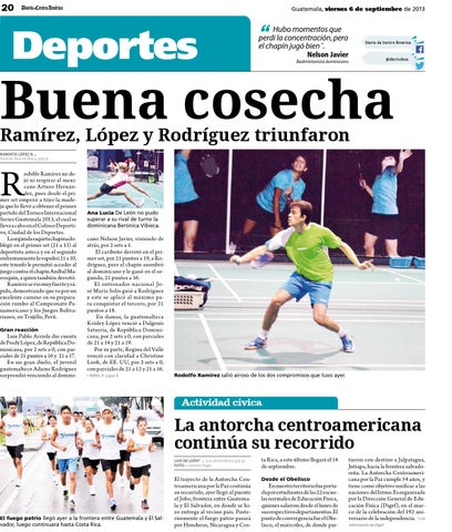 cano Nelson Javier, viniendo de atrás, por 2 sets a 1. El caribeño derrotó en el primer set, por 21 puntos a 19, a Rodríguez, pero el chapín asombró al dominicano y le ganó en el segundo, 21 puntos a 16. El entrenador nacional José María Solís guió a Rodríguez y este se aplicó al máximo para conquistar el tercero, por 21 puntos a 18. En damas, la guatemalteca Krisley López venció a Dalgenis Saturria, de República Dominicana, por 2 sets a 0, con parciales de 21 a 14 y 21 a 19. Por su parte, Regina del Valle venció con claridad a Christine Look, de EE. UU, por 2 sets a 0, con parciales de 21 a 12 y 21 a 16. FOTO: R. López R.