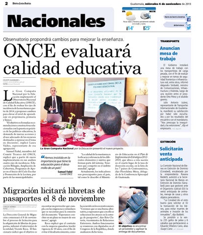 a Gran Campaña Nacional por la Educación implementó el Observatorio Nacional de Calidad Educativa (ONCE), con el fin de evaluar los ejes de incidencia de la enseñanza a partir de 2014, y proponer cambios para elevar el nivel de aprendizaje en preprimaria, primaria y básico. “El objetivo es formular recomendaciones constructivas relacionadas con la puesta en práctica de las políticas educativas, la demanda de nuevas acciones y el uso adecuado de los recursos destinados a mejorar en el tema en discusión”, explicó Laura Valdez, representante de esa agrupación. Samuel Fadul, miembro del Comité Técnico del ONCE, explicó que a partir de enero implementarán en sus análisis cuatro ejes de incidencia: Educación Bilingüe, Ampliación de Cobertura, Programas de Apoyo en el Inicio del Ciclo Escolar y Promoción de la Lectura, por parte de las municipalidades.