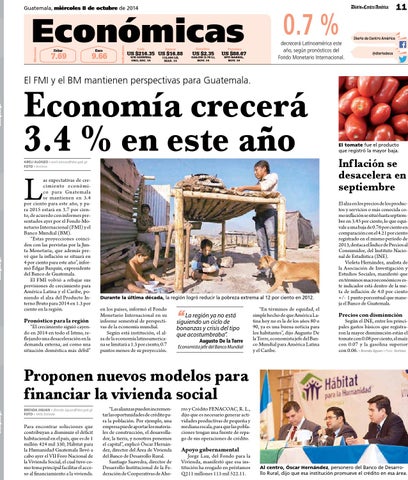 as expectativas de crecimiento económico para Guatemala se mantienen en 3.4 por ciento para este año, y para 2015 estará en 3.7 por ciento, de acuerdo con informes presentados ayer por el Fondo Monetario Internacional (FMI) y el Banco Mundial (BM). “Estas proyecciones coinciden con las previstas por la Junta Monetaria, que además prevé que la inflación se situará en 4 por ciento para este año”, informó Édgar Barquín, expresidente del Banco de Guatemala. El FMI volvió a rebajar sus previsiones de crecimiento para América Latina y el Caribe, poniendo el alza del Producto Interno Bruto para 2014 en 1.3 por ciento en la región.