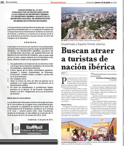 CONVOCATORIA No. 01-2014 CONCURSO POR OPOSICIÓN PARA OPTAR A LOS CARGOS DE SECRETARIO GENERAL Y/O SECRETARIO GENERAL ADJUNTO DE LA SECRETARÍA NACIONAL DE ADMINISTRACIÓN DE BIENES EN EXTINCIÓN DE DOMINIO La Vicepresidente de la República de Guatemala, Licenciada Ingrid Roxana Baldetti Elias, en su calidad de Presidente del Consejo Nacional de Administración de Bienes en Extinción de Dominio y conforme a lo previsto en el artículo 38 de la Ley de Extinción de Dominio, Decreto Número 55-2010 del Congreso de la República; En 2015 la ciudad será la Capital Cultural Iberoamericana.