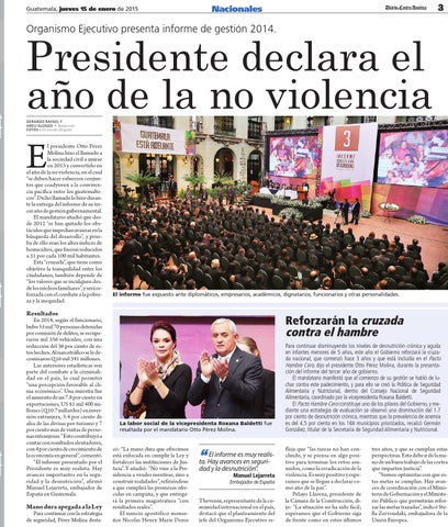 l presidente Otto Pérez Molina hizo el llamado a la sociedad civil a unirse en 2015 y convertirlo en el año de la no violencia, en el cual “se deben hacer esfuerzos conjuntos que coadyuven a la convivencia pacífica entre los guatemaltecos”. Dicho llamado lo hizo durante la entrega del informe de su tercer año de gestión gubernamental. El mandatario añadió que desde 2012 “se han quitado los obstáculos que impedían avanzar en la búsqueda del desarrollo”, y prueba de ello eran los altos índices de homicidios, que fueron reducidos a 31 por cada 100 mil habitantes. Esta “cruzada”, que tiene como objetivo la tranquilidad entre los ciudadanos, también depende de “los valores que se inculquen desde los núcleos familiares”, y será reforzada con el combate a la pobreza y la inequidad.