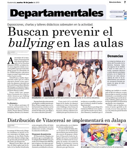 utoridades de la Auxiliatura Departamental de la oficina del Procurador de los Derechos Humanos (PDH), en Izabal, desde enero imparten charlas en escuelas públicas para prevenir el bullying, porque las autoridades de los establecimientos educativos juegan un papel importante para evitar el acoso escolar. Astrid Franco, auxiliar departamental, indicó que los centros educativos donde se han capacitado a los alumnos y docentes son la Escuela Primaria Mario Méndez Montenegro y el Instituto Experimental doctor Luis Pasteur, ambos de Puerto Barrios, Izabal. Franco indicó que, aunque hasta el momento no se han recibido denuncias por bullying contra menores, las charlas son de prevención.