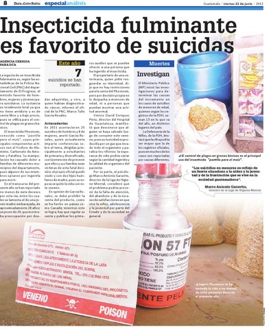 El control de plagas en granos básicos es el principal uso del insecticida "pastilla para el maíz". "Los suicidios en menores es reflejo de un fuerte abandono a la niñez y la juventud y de la frustración que se vive en la sociedad guatemalteca". Marco Antonio Garavito,