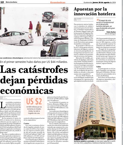 guros en este período, pues les costó US $2 mil 600 millones (Q20 mil 176 millones). Las tormentas de granizo en Francia, Alemania y Bélgica de junio costaron US $2 mil 500 millones (Q19 mil 400 millones) a las afianzadoras. Las condiciones climatológicas extremas de este invierno en Japón y en EE. UU. se tradujeron en un costo de US $2 mil 500 millones (Q19 mil 400 millones) y US $1 mil 700 millones (Q13 mil 192 millones) para las aseguradoras. En el conjunto del primer semestre, los costos de las catástrofes naturales que asumieron las compañías fueron de US $19 mil millones (Q147 mil 440 millones), frente a los US $21 mil millones (Q162 mil 960 millones) del mismo período de 2013, a los que hay que sumar las pérdidas de US $2 mil millones (Q15 mil 520 millones) por los desastres causados por la humanidad.