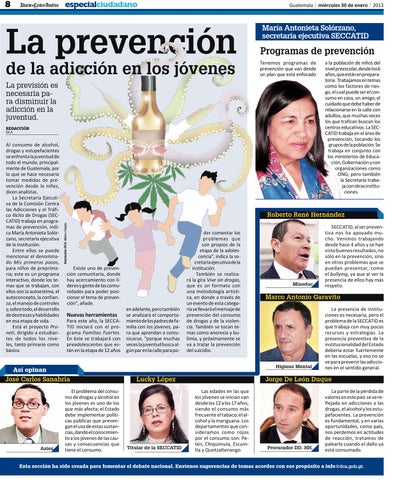 Al consumo de alcohol, drogas y estupefacientes se enfrenta la juventud de todo el mundo, principalmente de Guatemala, por lo que se hace necesario tomar medidas de prevención desde la niñez, dicen analistas. La Secretaría Ejecutiva de la Comisión Contra las Adicciones y el Tráfico Ilícito de Drogas (SECCATID) trabaja en programas de prevención, indica María Antonieta Solórzano, secretaria ejecutiva de la institución. Entre ellos se puede mencionar el denominado Mis primeros pasos, para niños de preprimaria; este es un programa interactivo, donde los temas que se trabajan, con ellos son la autoestima, el autoconcepto, la confianza, el manejo de controles y, sobre todo, el desarrollo de destrezas y habilidades en esa etapa de vida. Está el proyecto Proneti, dirigido a estudiantes de todos los niveles, tanto primario como básico.