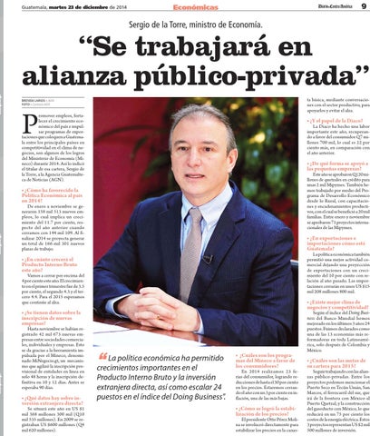 romover empleos, fortalecer el crecimiento económico del país e impulsar programas de exportaciones que coloquen a Guatemala entre los principales países en competitividad en el clima de negocios, son algunos de los logros del Ministerio de Economía (Mineco) durante 2014. Así lo indicó el titular de esa cartera, Sergio de la Torre, a la Agencia Guatemalteca de Noticias (AGN).