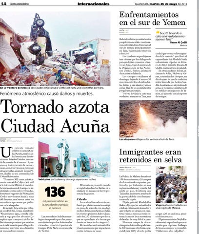 n potente tornado sembró el caos en Ciudad Acuña, una localidad mexicana fronteriza con Estados Unidos, causando la muerte de al menos 11 personas y la destrucción de carros y casas, donde se buscan a personas desaparecidas, anunció Lenin Pérez, alcalde de esa comunidad de 136 mil habitantes. “Tenemos 300 casas prácticamente inservibles”, dijo el jefe edil a la televisora Milenio al manifestar que camiones de transporte industrial cayeron sobre viviendas. bomberos y agentes de Protección Civil se movilizaron hacia la zona del desastre para buscar entre los escombros a personas que pudieran estar atrapadas. El alcalde, de la urbe que colinda con Del Río, Texas, manifestó: “Necesitamos agua, comida enlatada y ropa para los afectados”, y explicó que la mayoría de los fallecidos son personas que estaban en la calle cuando pasó el fugaz fenómeno, que tuvo una duración de menos de un minuto.
