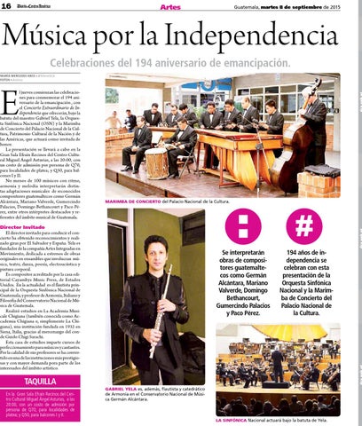 l jueves comienzan las celebraciones para conmemorar el 194 aniversario de la emancipación , con el Concierto Extraordinario de Independencia que ofrecerán, bajo la batuta del maestro Gabriel Yela, la Orquesta Sinfónica Nacional (OSN) y la Marimba de Concierto del Palacio Nacional de la Cultura, Patrimonio Cultural de la Nación y de las Américas, que actuará como invitada de honor. La presentación se llevará a cabo en la Gran Sala Efraín Recinos del Centro Cultural Miguel Ángel Asturias, a las 20:00, con un costo de admisión por persona de Q70, para localidades de platea; y Q50, para balcones I y II. No menos de 100 músicos con ritmo, armonía y melodía interpretarán distintas adaptaciones musicales de reconocidos compositores guatemaltecos como Germán Alcántara, Mariano Valverde, Gumercindo Palacios, Domingo Bethancourt y Paco Pérez, entre otros intérpretes destacados y referentes del ámbito musical de Guatemala.