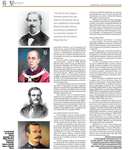 “Una de las más largas e intensas autocracias que hubo en Guatemala, fue la que estableció el licenciado Manuel Estrada Cabrera, teniendo por peldaño de su ascensión al poder el asesinato del presidente Reyna Barrios.” antecedente histórico en Centroamérica el hecho de que, a partir de finales del siglo XIX, el istmo se subordinó hacia el modelo cultural europeo y estadounidense, primando la construcción de una sociedad vinculada al mercado mundial, antes que una sociedad integrada internamente. En este sentido, resalta el hecho de que, específicamente, a partir de 1898, Manuel Estrada Cabrera tomó el cargo presidencial en Guatemala, dejándolo solo 22 años después. Al respecto, este régimen se caracterizó, en la primera década del siglo XX, por otorgar concesiones en beneficio de la International Railways of Central America – IRCA- y la United Fruit Company -UFCo.-, lo cual benefició, en buena medida, al capital norteamericano. Esto marcó, sin duda, a la sociedad guatemalteca de aquel momento. De hecho, la misma obra, en el tercer tomo, denuncia que: Una de las más largas e intensas autocracias que hubo en Guatemala, fue la que estableció, durante su mando el licenciado Manuel Estrada Cabrera, teniendo por peldaño de su ascensión al poder, el asesinato cometido en la persona del Presidente Reyna Barrios. Sin embargo, como se mencionó arriba, muchas de estas opiniones pudieron deberse a que Estrada Cabrera no lo tomara en cuenta dentro de la vida política. De hecho, más adelante, en uno de los pasajes finales de la obra, Batres Jáuregui narra cómo el presidente Cabrera no solo le impidió la incidencia política, sino que también le imposibilitó fungir como albacea de la testamentaria de un amigo en 1918.