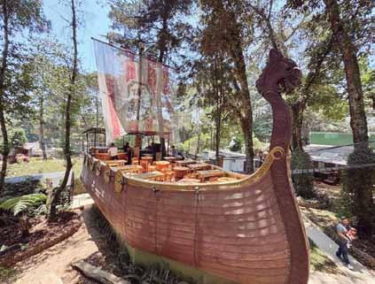 me zambullí en la naturaleza. Me sentí como en la casa terrenal de Odín, el dios nórdico, todo lo que observaba era inspirado en esa cultura y sus tradiciones. Mi estancia fue placentera en la habitación que emulaba una cabaña, con una cama confortable, una chimenea, instalaciones limpias y rodeadas de paisajes entre flores. Antes de cenar, caminé por los senderos, las bancas que evocaban a la antigua mitología escandinava, navíos, fogatas, incluso un dragón al que se puede subir para las fotos. Luego, pasé al gran festín de la comida, en su restaurante ambientado con espadas, martillos, escudos dorados, piedras rúnicas. Mi selección fue un churrasco y papas fritas, había más de 30 opciones y los precios oscilan entre 60 quetzales y 300 quetzales, aproximadamente. También se puede tomar fotografías con los cascos con cuernos para sentirte vikingo por un día. A la mañana siguiente me regocijé