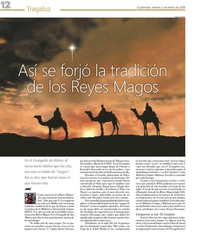 po, director del Departamento de Manuscritos, Incunables y Raros de la BNE. En el Evangelio se cuenta que unos magos llegan de Oriente a Jerusalén buscando al rey de los judíos, cuyo nacimiento les ha sido revelado por una estrella. Herodes el Grande, gobernante de Palestina, les convoca a su palacio, les interroga y les hace prometer que regresarán cuando hayan encontrado al Niño para que él también vaya a adorarlo. Después, llegan hasta el lugar donde se ubica la estrella y descubren al Niño con María y se postran ante él para ofrecerle oro, incienso y mirra. Advertidos en sueños de no volver ante Herodes, toman por otro camino. Para remediar la parquedad del relato evangélico, se desarrolló la historia de los “magos de Oriente” en los evangelios apócrifos. El término de mago debe ser interpretado en sentido de astrólogo, de especialista en el firmamento, asegura Docampo, que explica que dados los significados negativos del término, pronto fueron dignificados como reyes. Tertuliano, en el siglo III, fue el primero que les denominó como tales. Más tarde, a lo largo de la Edad Media se fue configurando