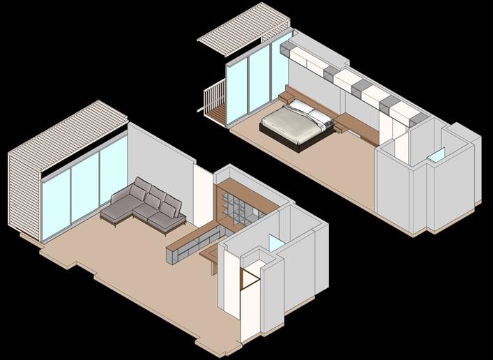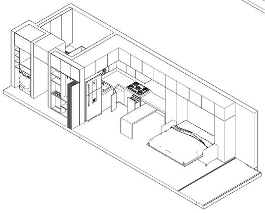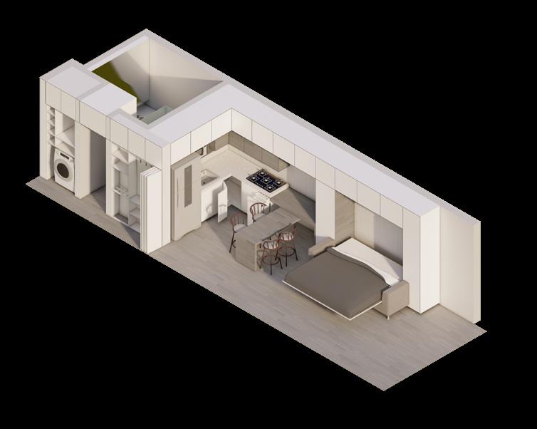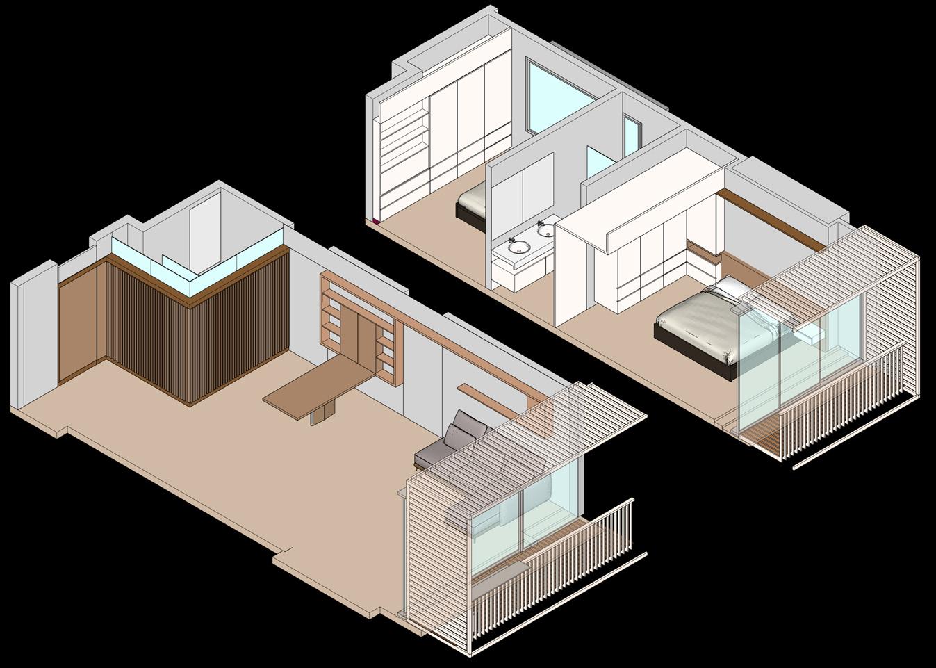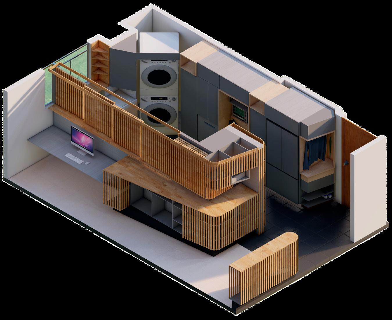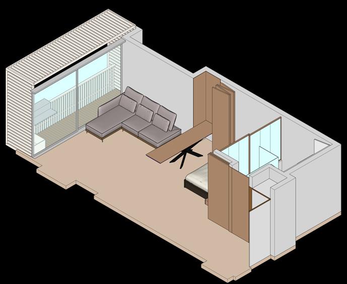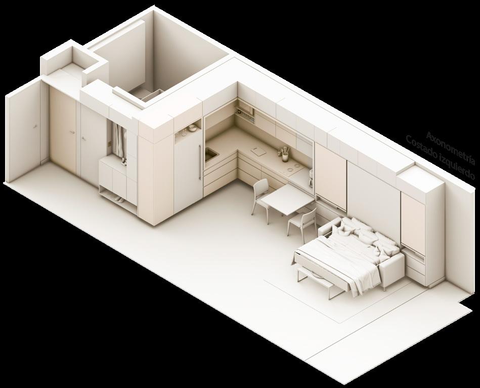 Se continúa con el modelado y renderizado del apartamento de 33m2 con los mismos principios de mobiliario dual que permita abarcar varias actividades en el interior de la vivienda.