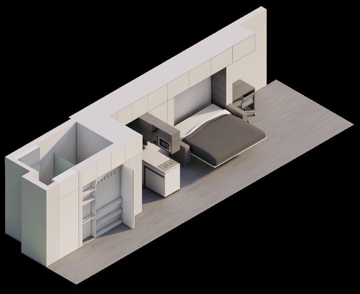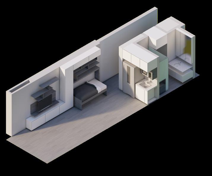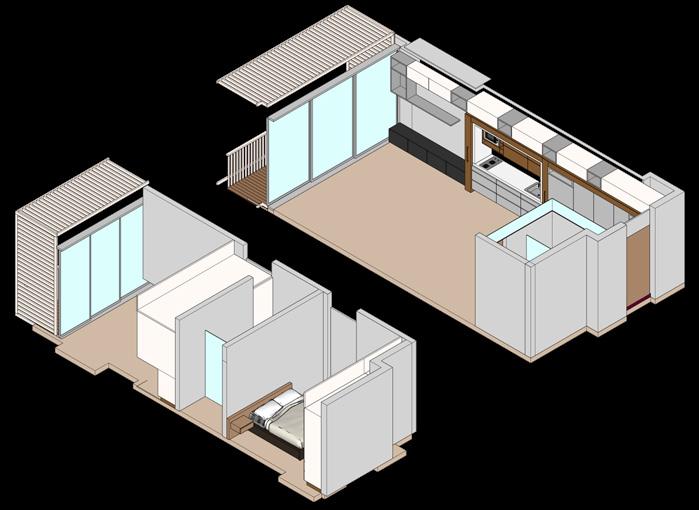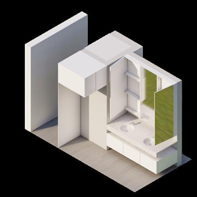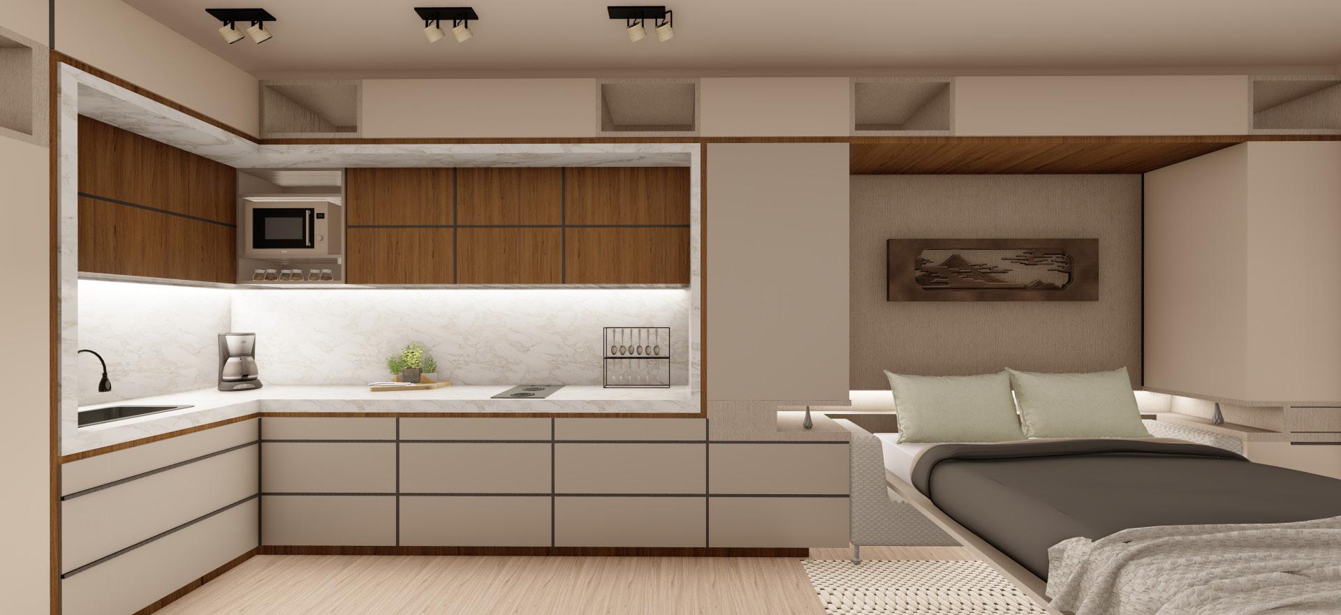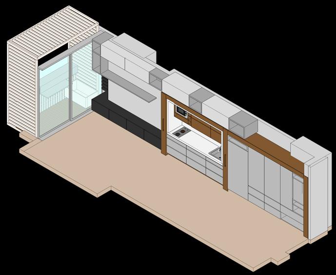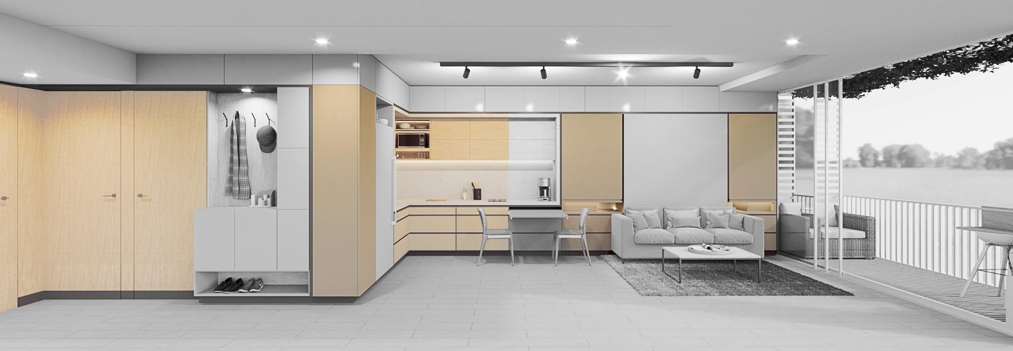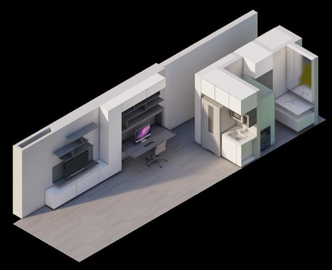 Se continúa con el modelado y renderizado del apartamento de 33m2 con los mismos principios de mobiliario dual que permita abarcar varias actividades en el interior de la vivienda.
