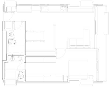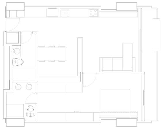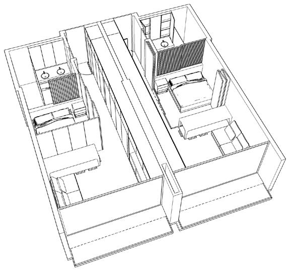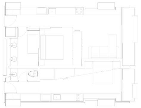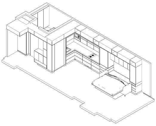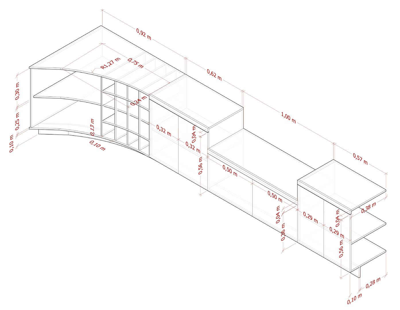 El mobiliario dual se elabora con la finalidad de que el apartamento de 43m2 permita el desarrollo de diferentes actividades desde la flexibilidad que posee el mobiliario que se integra al espacio. El mobiliario se apoya en los muros longitudinales, estableciendo voladizos y retrocesos, y ocupando parcial o totalmente el muro dependiendo de la función que corresponde en cada uno de los momentos. El mobiliario consta de: Mueble tv, cama individualescritorio, mueble de aseo, mueble de ropas, alacena, mesa retráctil, 2 armarios y cama doble - sofá.
