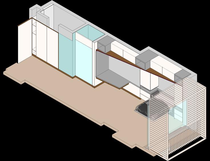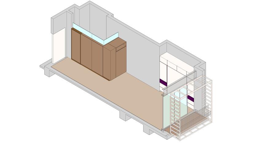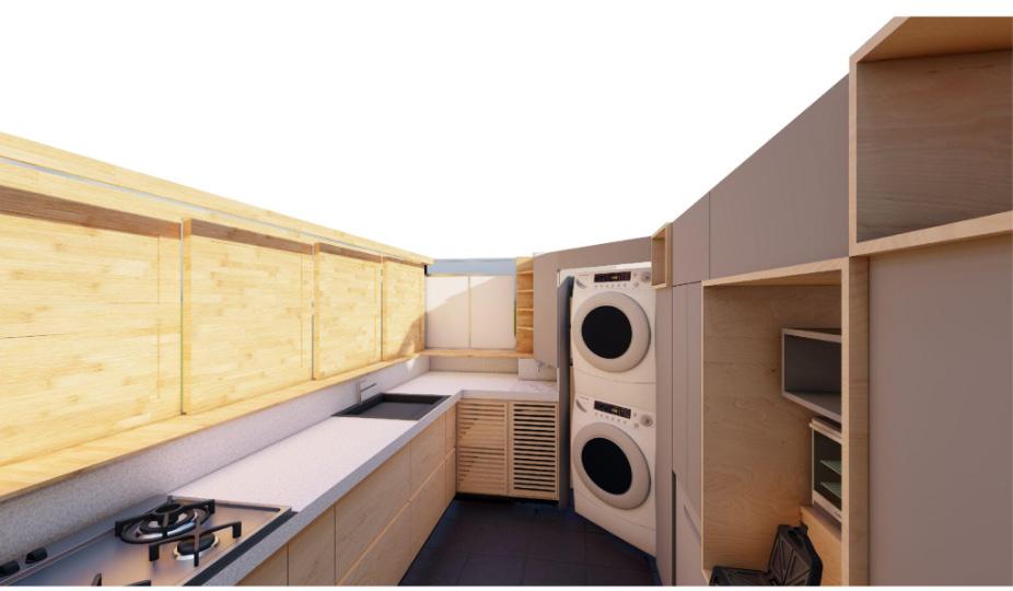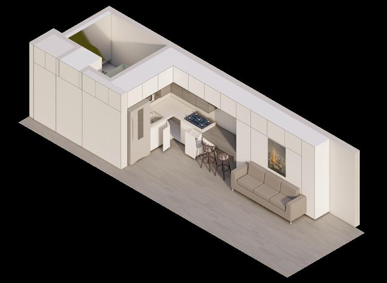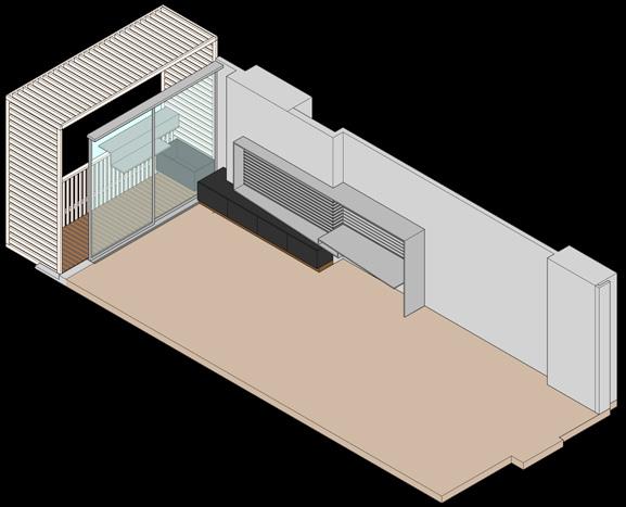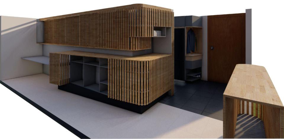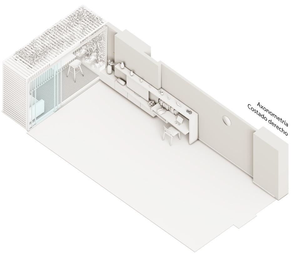 La actualización de las plantas permitió el aprovechamiento de nichos que surgieron a partir de desfaces en los muros. Conceptualmente se implementa la configuración de marcos alrededor de los nichos, diferenciados a través de la materialidad, trabajando conjuntamente con desniveles en el cielorraso. El balcón comienza a tejerse con el mobiliario, creando continuidades desde la perspectiva del peatón y posibilitando un acercamiento a la propuesta de fachada del edificio en conjunto. El funcionamiento es necesario para la localización de accesorios en el render.