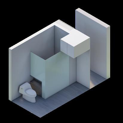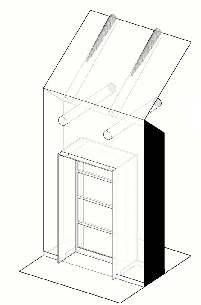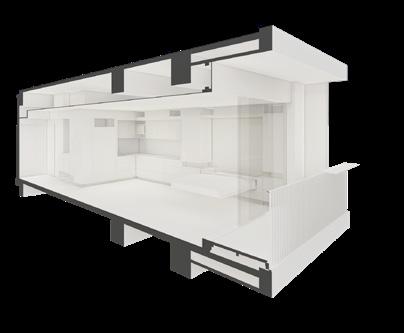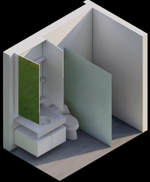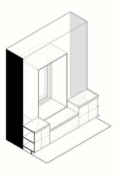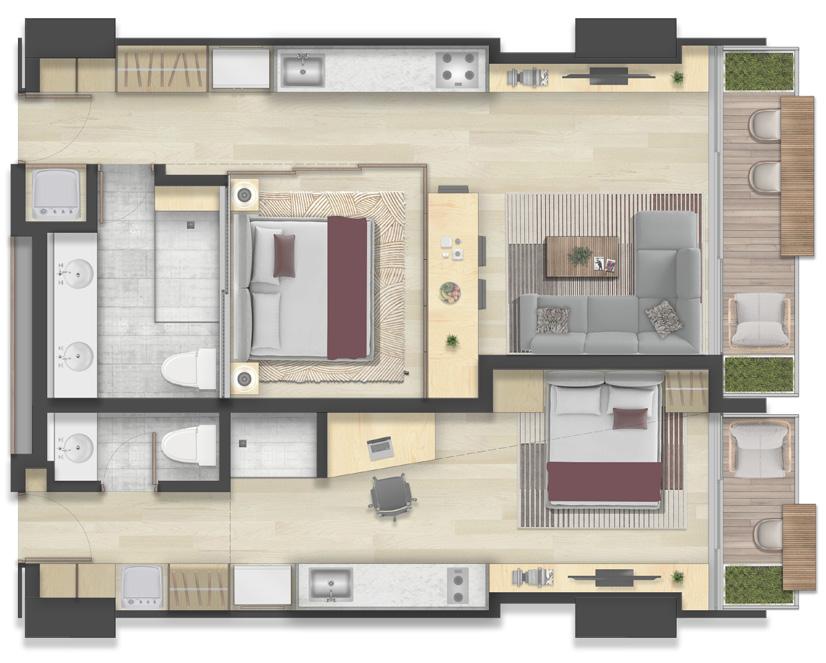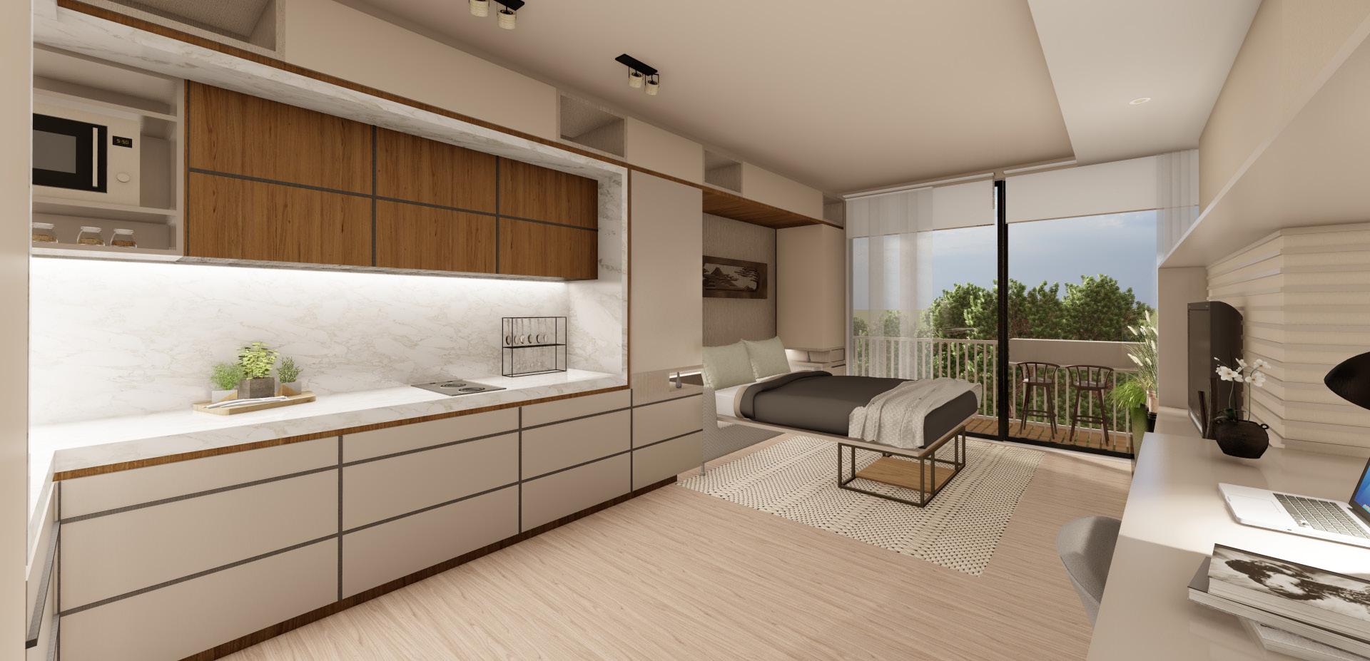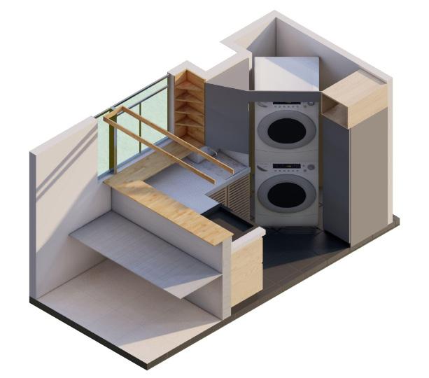 La actualización de las plantas permitió el aprovechamiento de nichos que surgieron a partir de desfaces en los muros. Conceptualmente se implementa la configuración de marcos alrededor de los nichos, diferenciados a través de la materialidad, trabajando conjuntamente con desniveles en el cielorraso. El balcón comienza a tejerse con el mobiliario, creando continuidades desde la perspectiva del peatón y posibilitando un acercamiento a la propuesta de fachada del edificio en conjunto. El funcionamiento es necesario para la localización de accesorios en el render.