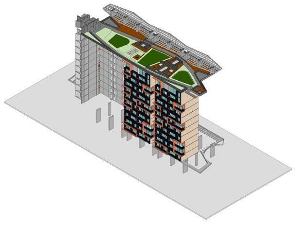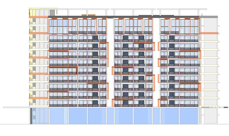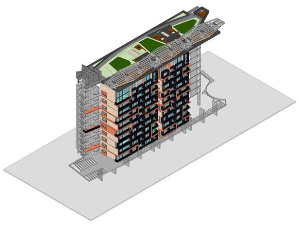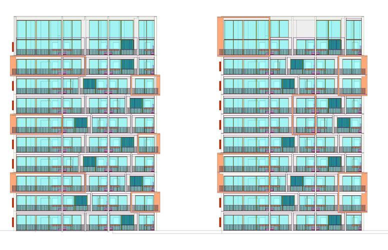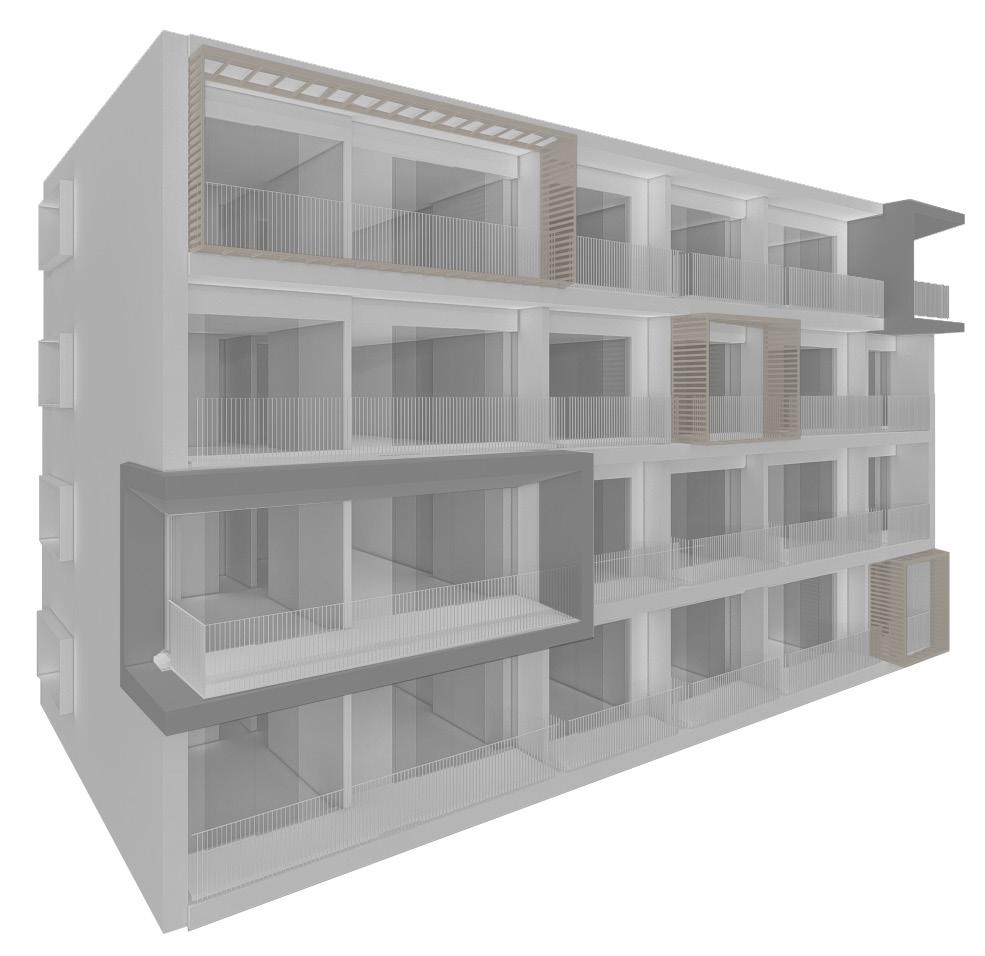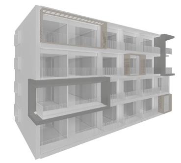 El último entregable consiste en el diseño de las fachadas y las zonas comunes. El modelado de las torres inició con varias versiones de la combinación de los apartamentos de 33m2, 43m2 y 53m2, el apartamento de 86m2 posee una localización especifica en todos los pisos debido a la localización del punto fijo. El concepto de fachada inicia con la implementación de marcos en un ritmo que marca las esquinas opuestas con mayor verticalidad y un ritmo en un nivel de 2:1:2, evitando que se repita en ambos extremos en la misma torre.