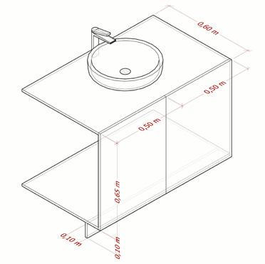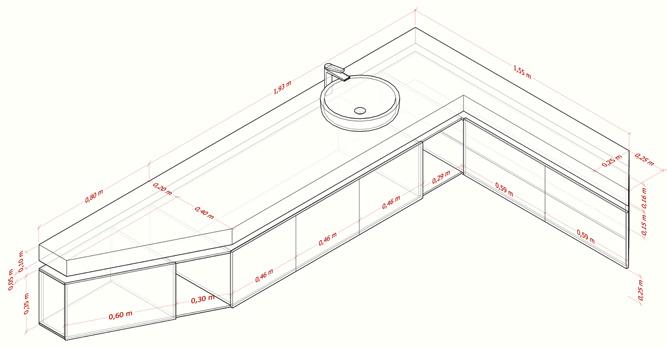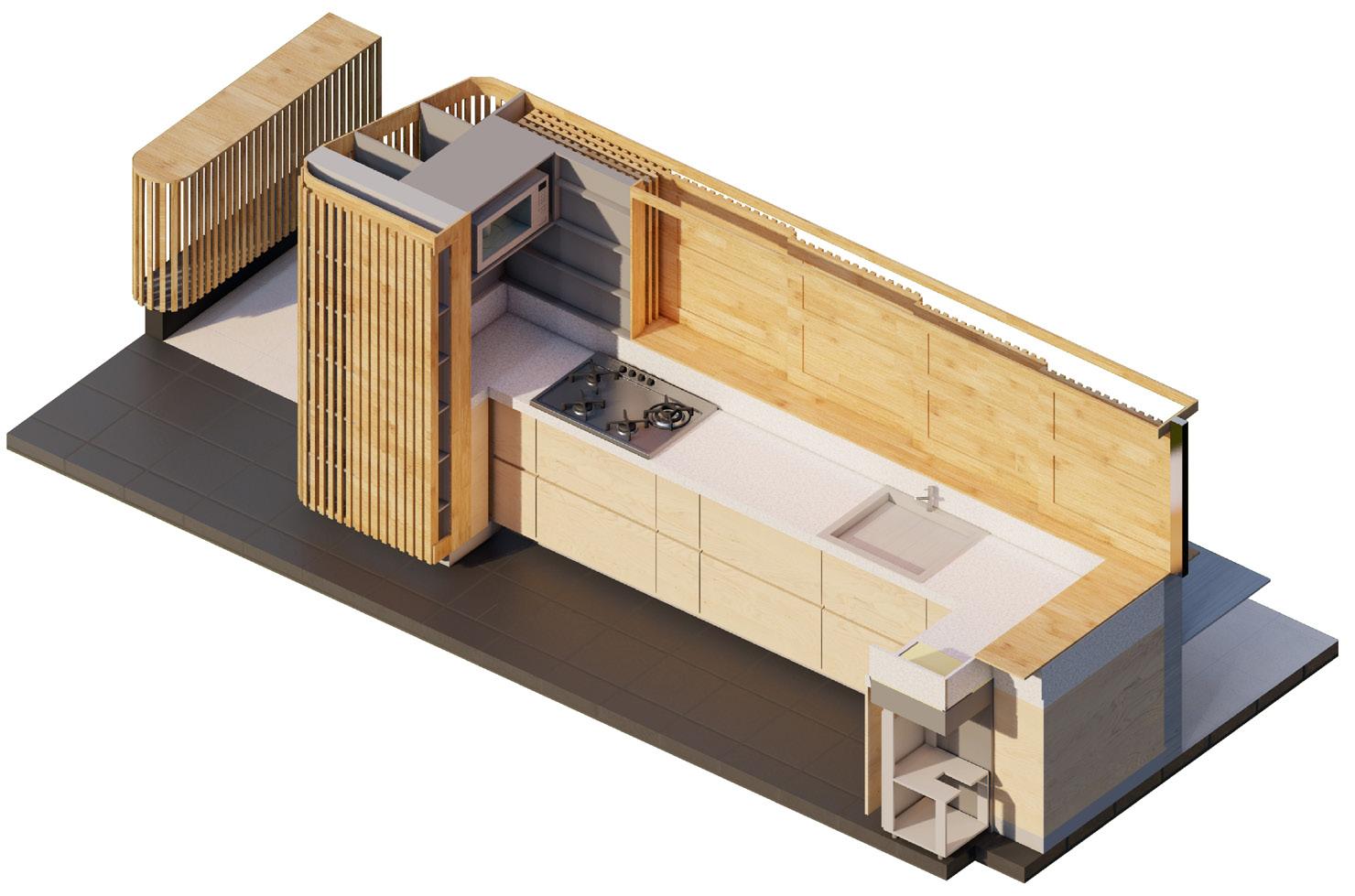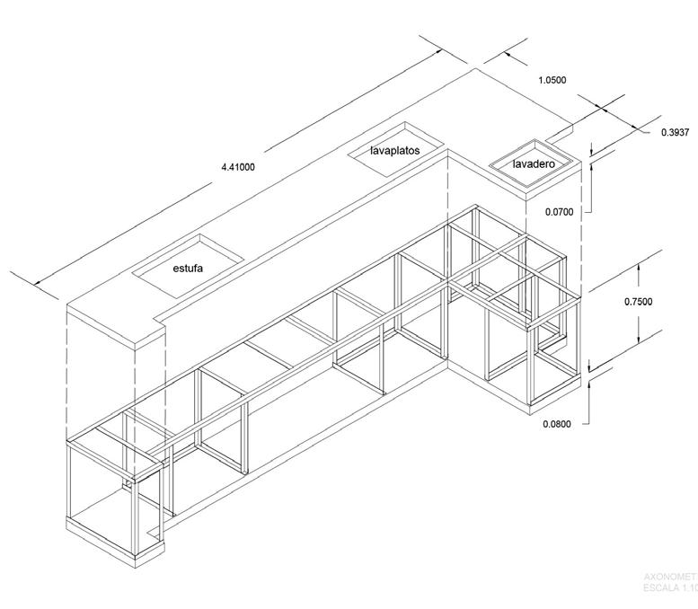 El mueble de la cocina tiene en cuanta medidas específicas para los condimentos, cajón para cubiertos, cristalería, canecas de basura, lavadero, estufa y platero actual y permite un dialogo con el mueble existente al costado derecho, además se vincula con el mueble proyectual en la sala.