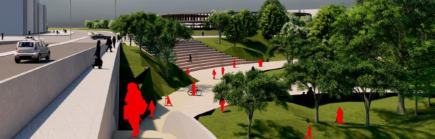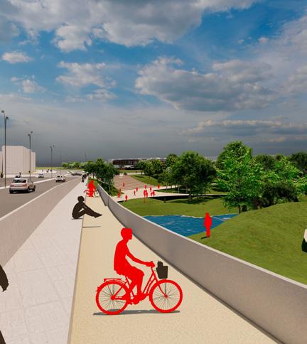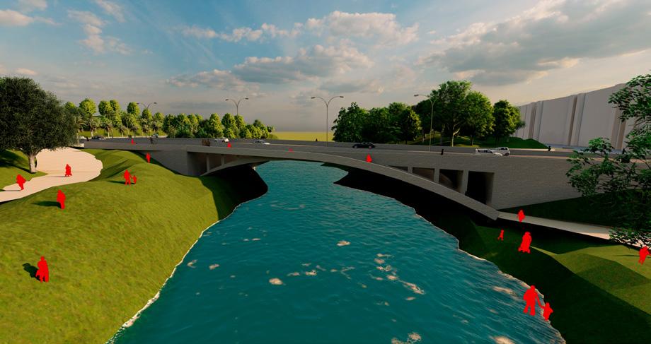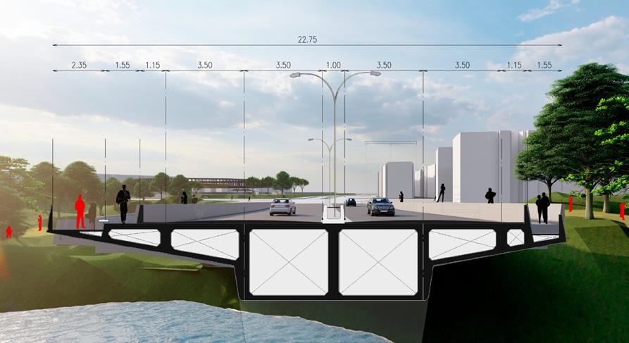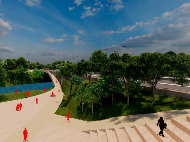 La propuesta proyecta diferentes niveles para el peatón, la bicicleta y los carriles vehiculares con el objetivo de permitir la visual al Río desde cualquier medio de transporte y no obstaculizarse entre sí, permitiendo la relación de borde con un parque proyectual que reguarda la ronda.