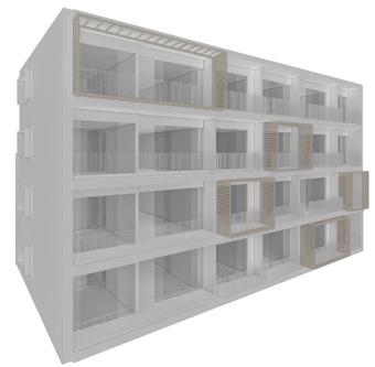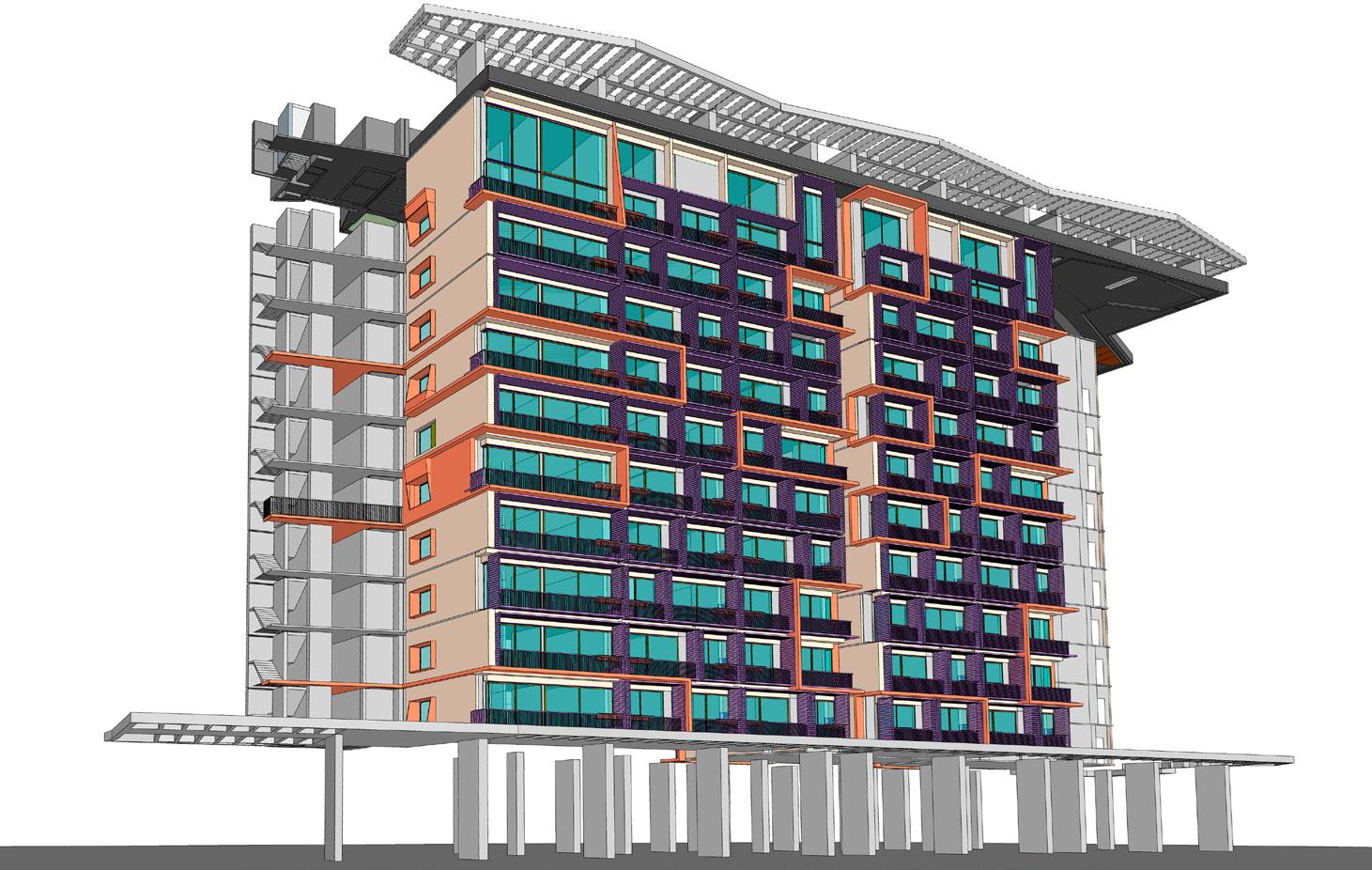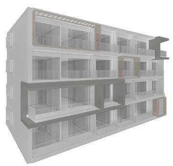 La composición de la fachada de los Apartamentos en Cali se retomó con la modificación del diseño a partir de decisiones estructurales y de presupuesto que permitieran reducir costos de acuerdo a las posibilidades en la fachada general. La presentación se realizó mostrando las posibilidades desde el apartamento tipo, continuando con las modificaciones en el ritmo tomando como muestra 4 niveles que permitan visualizar las opciones acordes con la parte financiera. Además se modificó el modelo 3D del mobiliario del apartamento de 35m2.