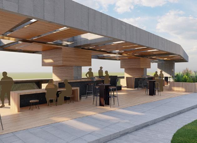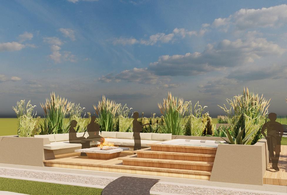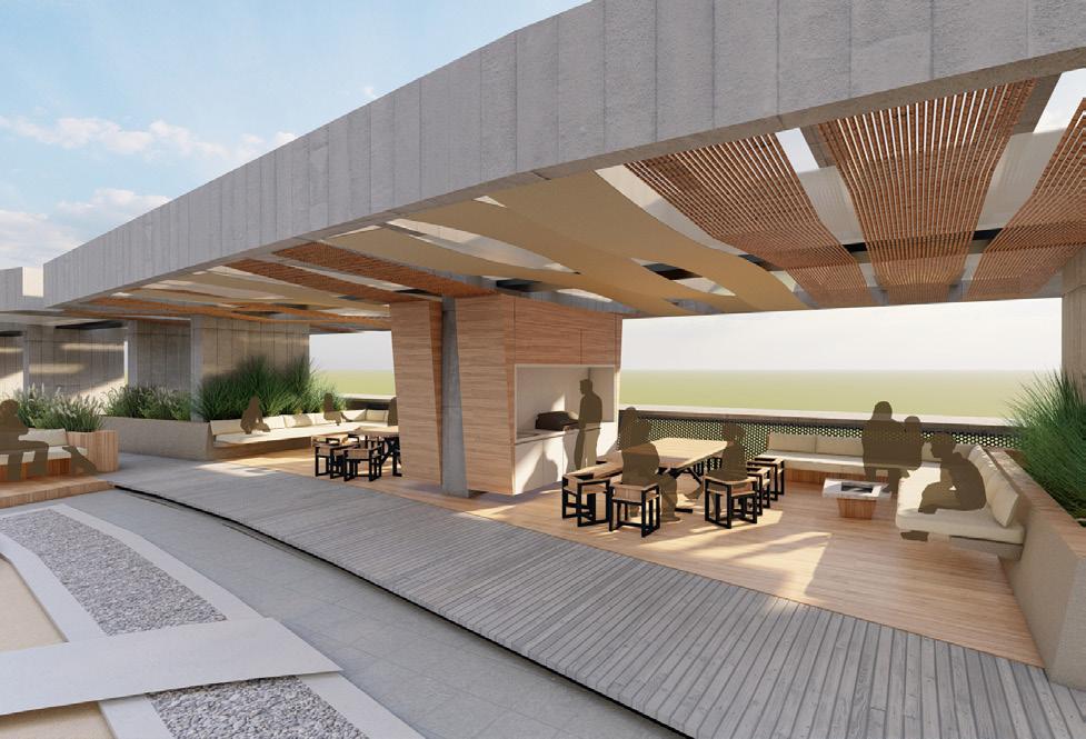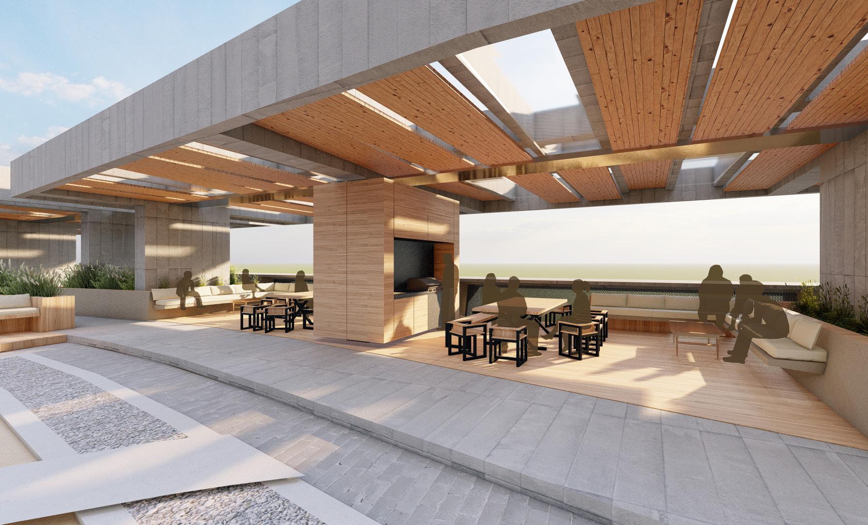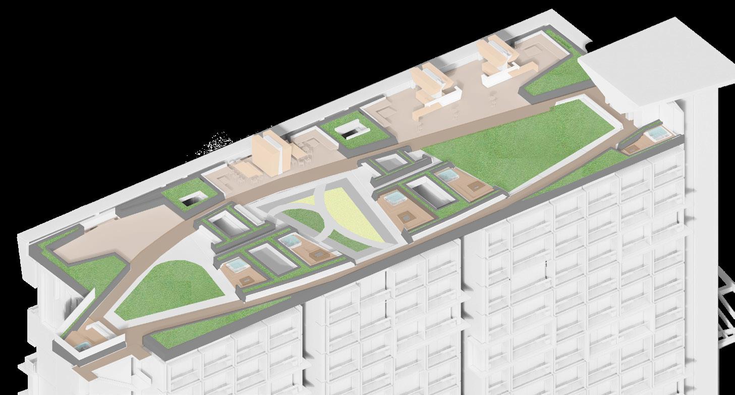 Las amenidades localizadas en la cubierta se dividieron en dos zonas: Jacuzzis y BBQ-bar. Los Jacuzzis implementan una vegetación de alto porte para darle privacidad, la zona BBQ usa como referente los quinchos argentinos que involucran la cocción como una actividad primordial en el intercambio social. La vegetación localizada en el borde del edificio es de bajo porte para permitir la visual de los cerros de Cali, y se realiza un juego de luz por medio del movimiento de los módulos localizados en el cielorraso de la pergola.