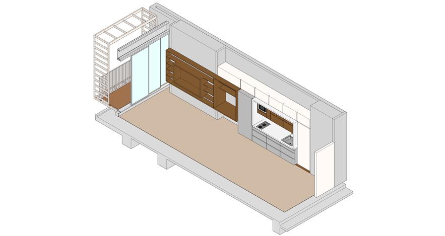 El mueble de la sala se elabora con la materialidad de un mueble existente en madera de roble. Tiene en cuenta diferentes cambios de altura en concordancia con la barra de la cocina, el escritorio y mueble actual que permite la posibilidad de leerlo como un solo espacio.