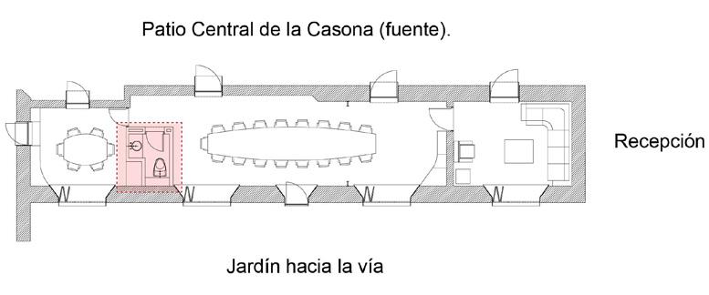 El mueble de la oficina dialoga con la altura del vano de la ventana y permite guardar variedad de elementos. Las ventanas conservan la diagonal actual que se proyecta hasta el mobiliario y establece las curvas como transición de la residencia actual con la propuesta.