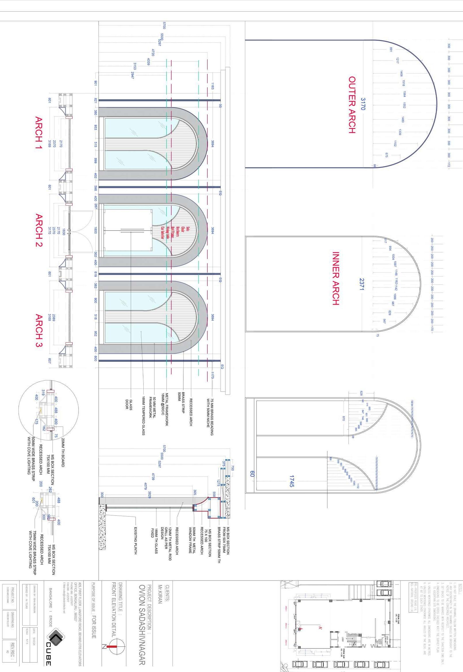 BRASS STRIP 50MM TH RECESSED ARCH RECESSED ARCH 12MM TH METAL ROD GRILL AS PER DESIGN 50MM TH METAL WINDOW FRAME MS BOX SECTION FROM 100X100MM 3547 611 544 600 150 150 311 1814 304 305 5750 5750 EXISITNG PLINTH 305 5750 BRASS BEADING WITH 50MM NICHE RECESSED ARCH GLASS DOOR BRASS STRIP 50MM BRASS FRAMEWORK 50 MM METAL FRAMEWORK ALUMINIUM FRAMEWORK 50MM 50 EQ EQ EQ 4096 4096 4096 2613 3176 4028 4729 5750 1235 1226 3025 2094 3078 3015 1235 1226 2094 2100 R1209 R1451 R1570 R1365 R1451 R1554 3572 2939 2769 1295 305 1295 1033 4595 601 1895 315 594 R1365 R1451 1278 1255 1326 252 1226 939 939 2917 2768 3571 3571 2938 2766 ARCH 1 ARCH 2 ARCH 3 16MM TH GLASS FIXED MS BOX SECTION FROM 75 X100MM BRASS STRIP 50MM TH 3569 4774 601 2770 2570 601 3570 2770 2570 4772 601 2770 2570 3569 4771 13120 1830 480 600 480 480 4861 3660 601 2861 400 400 2660 400 400 400 400 400 2860 601 600 600 600 601 400 2860 400 602 3650 3650 4861 4523 4260 400 2879 ARCH 1 ARCH 2 ARCH 3 B A 2.50 5.36 24.27 24.15 13.01 15.98 5.86 3.70 91 89° 0.23 3.32 89° 91° BASEMENT PROFILE BELOW DN 3.32 2.50 12.61 400 488 400 162 175 400 319 MS BOX SECTION 75X100 MM 20MM TH BOARD 50MM WIDE BRASS STRIP WITH COVE LIGHTING RECESSED ARCH 396 488 488 400 162 200 262 200 400 300 MS BOX SECTION 75X100 MM RECESSED ARCH 50MM WIDE BRASS STRIP WITH COVE LIGHTING 75 CHECKED BY Ar. Sandeep PURPOSE OF ISSUE : FOR DISCUSSION PROJECT DESCRIPTION DRAWING NO. DRAWN BY ISHA MUSKAAN SCALE N.T.S #29 FIRST FLOOR ,LANGFORD ROAD, BEHIND OTIS ELEVATORS OFFICE, BENGALURU 560027 PHONE-080 41237977 FAX-080 41237977 E-Mail-cube@cubearchitects.net OVION SADASHIVNAGAR REV.REC BANGALORE ERODE DATE 27-02-24 N PROJECT NO. CUBE/ARC/COMM/ R1 DRAWING TITLE CLIENTS: Mr.KIRAN FRONT ELEVATION DETAIL CUBE/ARC/ELE/01 PLAN FRONT ELEVATION CROSS-SECTION AA'