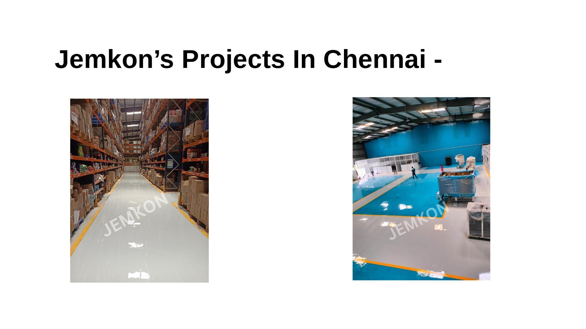 Epoxy floor coating is a highly durable, High Gloss, Excellent Self Leveling Properties and decorative flooring solution. It is a preferred flooring solution for garages,Chemical Factory, warehouses and industrial spaces as it can withstand heavy load use. When it comes to choosing new flooring systems for industrial use or any other outdoor surfaces, epoxy resin flooring truly stands out from other flooring options for many reasons. Jemkon Industrial epoxy Flooring Services in Chennai provides excellent epoxy flooring.Our Epoxy flooring is beneficial for manufacturing industry it is cost effective, long lasting. & other excellent advantages like Easily Cleanable & Good Abrasion Resistance Jemkon Industrial epoxy Flooring Services in Chennai is best for your industrial and commercial type of projects. epoxy paints or floor coatings is basically a thermos setting resin used chiefly in strong adhesives and coatings and laminates. for details please contact us - 8956740753, mail us on -