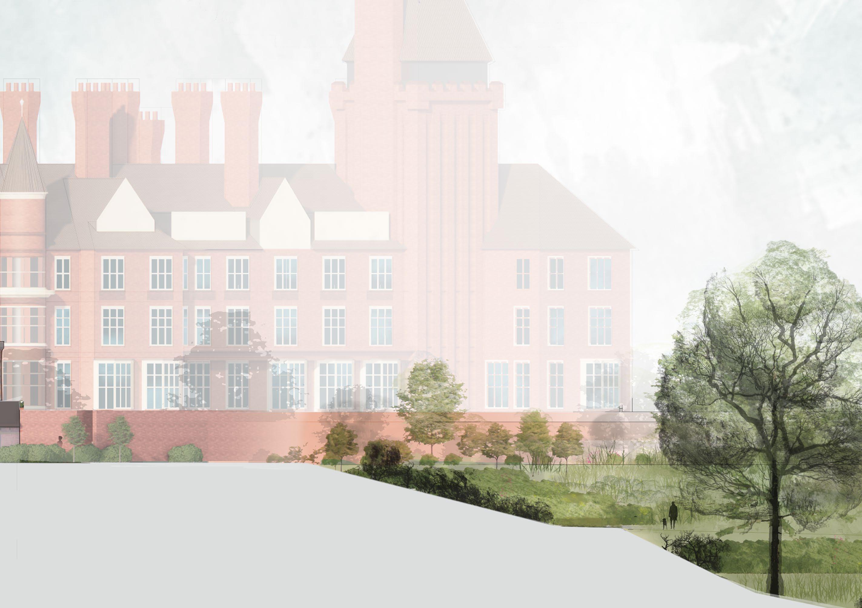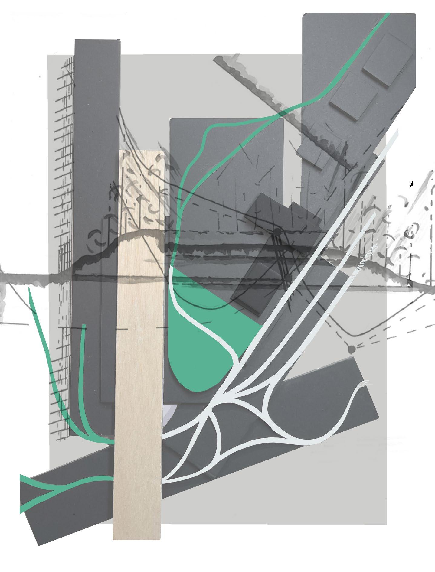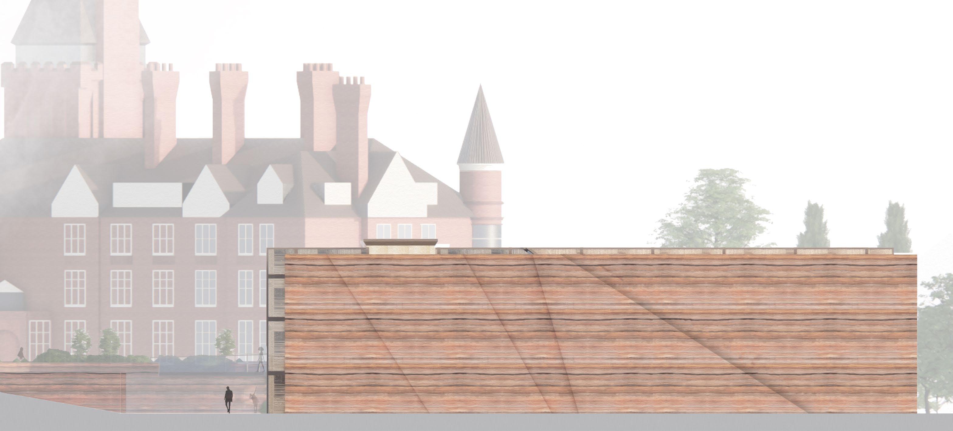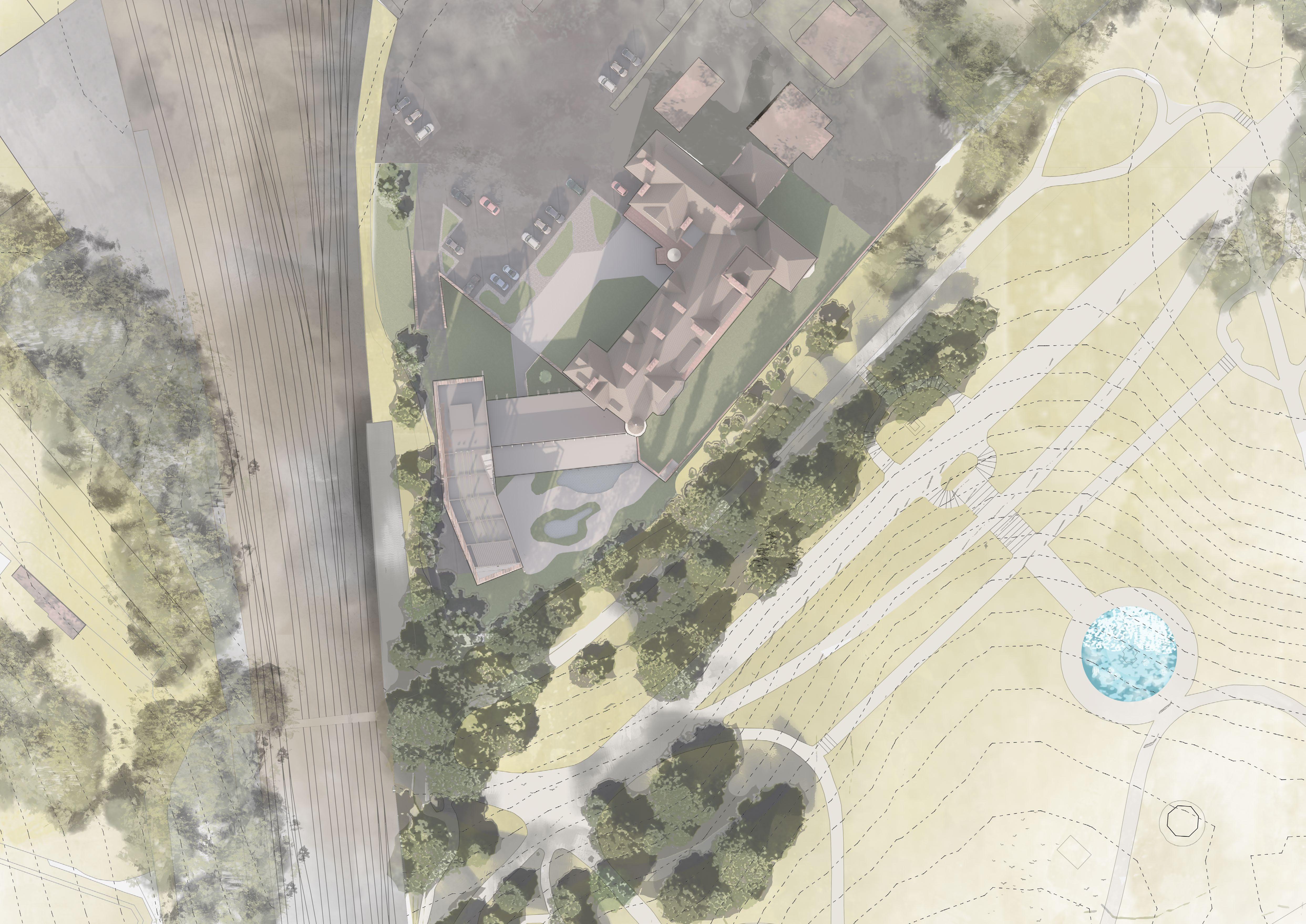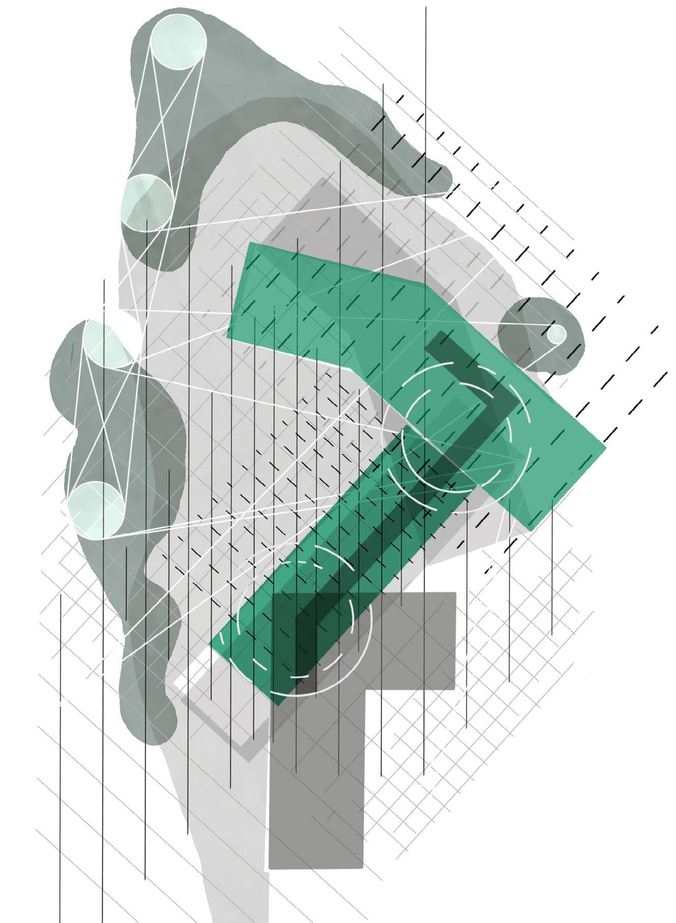 This model with an overlayed sectional study expresses the dynamic topography of the context alongside the axes used for the extension.