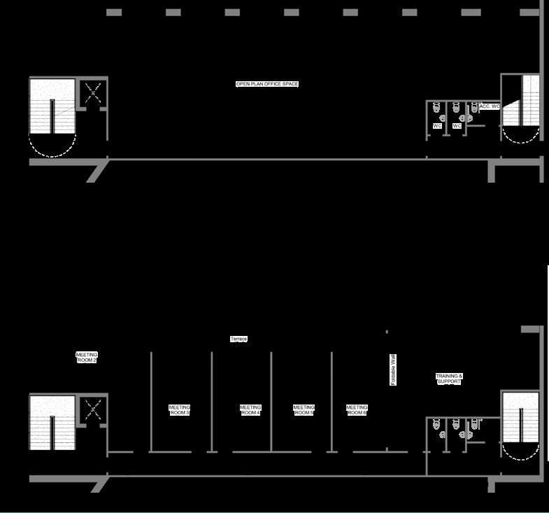 This section shows the interior of the second part of the extension. The Workshop features an open double height space with a mezanine for the design space.