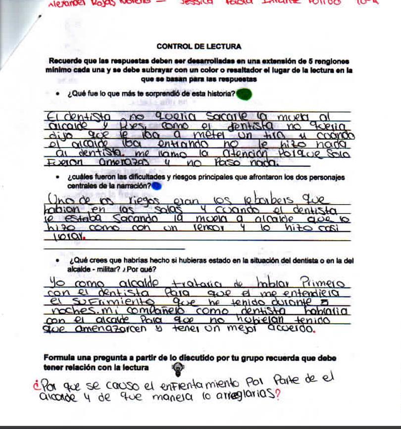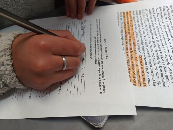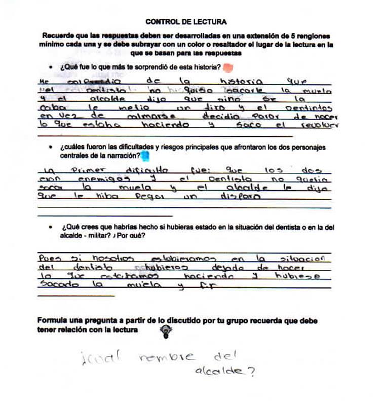 A continuación, formamos grupos de dos estudiantes y distribuimos una lectura de Gabriel García Márquez con el cuento un día de estos, acompañada de un control de lectura. Para desarrollar esta actividad, los estudiantes debían subrayar con resaltador las partes relevantes del texto, lo que nos permitió identificar cómo fundamentaban sus respuestas. Durante el proceso, los acompañamos en la resolución de dudas y cuestionamientos que surgían.