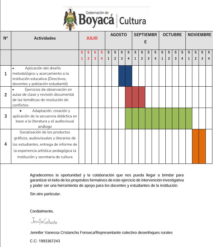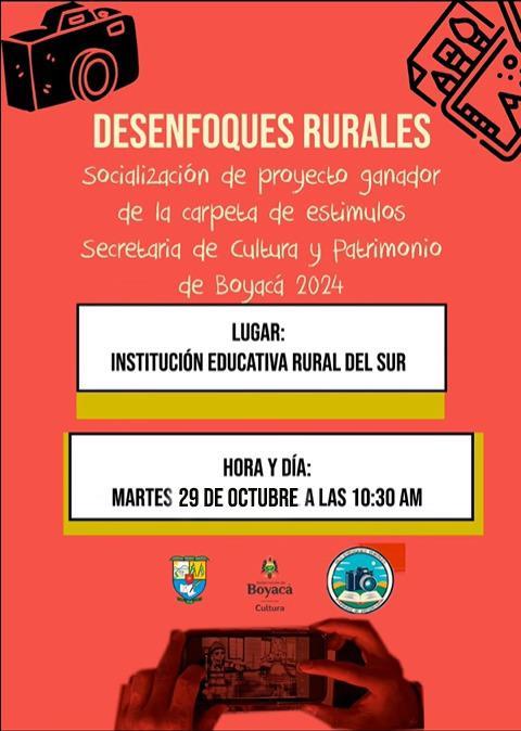 El proyecto Desenfoques Rurales se desarrolló a lo largo de 12 visitas a la institución educativa Rural del Sur. Las primeras cuatro visitas se enfocaron en la consolidación del trabajo con directivos y docentes, con el objetivo de definir la población participante (estudiantes del curso 10ª A Y 10° B) Estos encuentros iniciales permitieron establecer los primeros acercamientos y acuerdos.