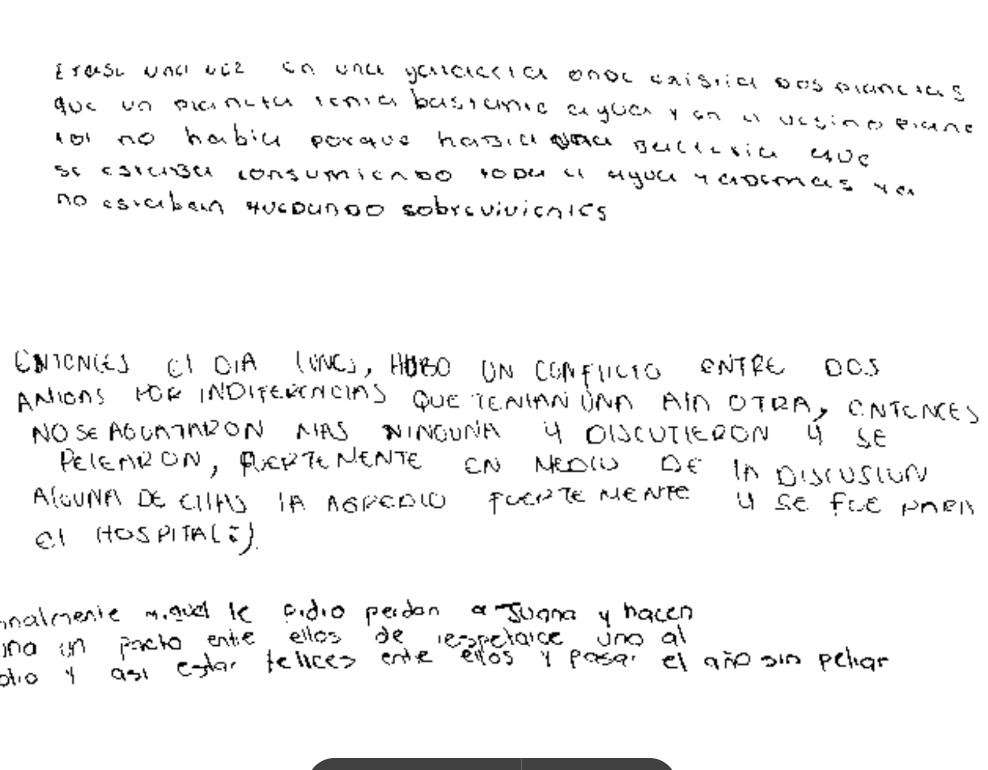 La parte final de la sesión consistió en la creación individual de un cuento, donde cada estudiante debía narrar un conflicto y su resolución. Este cuento servirá como base para la creación del audiovisual análogo que desarrollaremos en las próximas sesiones.