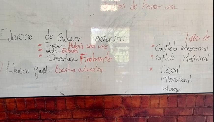 El segundo diario de campo corresponde a la segunda sesión de clase, realizada el 05/09/2024. En esta ocasión, asistieron 12 estudiantes debido a la ausencia del docente titular y los bloqueos del paro camionero, nuevamente del curso 10º A. Para mantener un mejor control del grupo, contamos con el acompañamiento de una docente de la institución. Iniciamos la sesión con una retroalimentación sobre la importancia de la lectura y la escritura en la vida cotidiana. A continuación, organizamos en el tablero un esquema que detalla la estructura y las actividades de la clase. Posteriormente, explicamos de forma teórica el concepto de conflicto. Después, introdujimos las partes de un cuento inicio, nudo y desenlace , y entregamos hojas en blanco para iniciar un ejercicio de escritura. Como parte de esta dinámica, realizamos una actividad de escritura creativa llamada “cadáver exquisito” para fomentar la imaginación y el trabajo colaborativo. Para ello, dividimos a los estudiantes en grupos, asignando a cada grupo una de las partes del cuento: introducción, desarrollo del conflicto o resolución. Cada grupo escribió su parte sin conocer lo que los otros estaban redactando. Al finalizar, realizamos una lectura en voz alta, donde los estudiantes compartieron las historias completas, dando lugar a cuentos inesperados y divertidos.