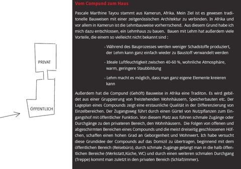 Außerdem hat die Compund (Gehöft) Bauweise in Afrika eine Traditon. Es wird gebildet aus einer Gruppierung von freistehenden Wohnhäusern, Speicherbauten etc. Der Lageplan eines Compounds zeigt eine erstaunliche Qualität in der Differenzierung von Einzelbereichen. Der Zugangsweg führt durch einen Gürtel von Nutzpflanzen zum Eingangshof mit öffentlicher Funktion. Von diesem Platz aus führen schmale Zugänge oder Durchgänge zu den privateren Bereich, den Wohnhäusern. Die Folgen von offenen und abgeschirmten Bereichen eines Compounds und die meist dreiseitig geschlossenen Höfchen, schaffen einen hohen Grad an Geborgenheit und Wohnwert. Ich habe versucht diese Grundidee der Compounds auf das Domizil zu übertragen, beginnend mit dem öffentlichen Bereich (Reisebüro), durch schmale Zugänge gelangt man in die halb öffentlichen Bereiche (Werkstatt,Küche, WC) und durch einen weiteren schmalen Durchgang (Treppe) kommt man zuletzt in den privaten Bereich (Schlafzimmer).