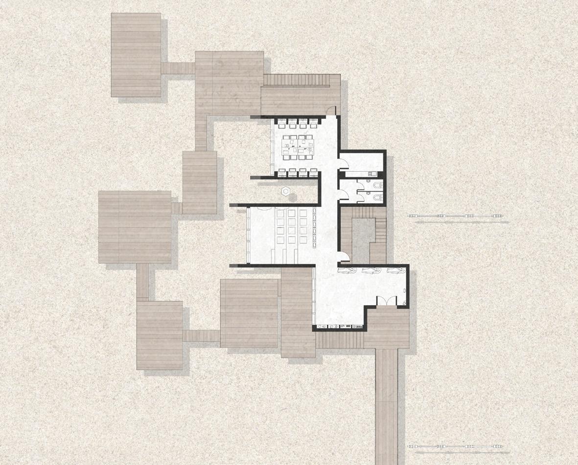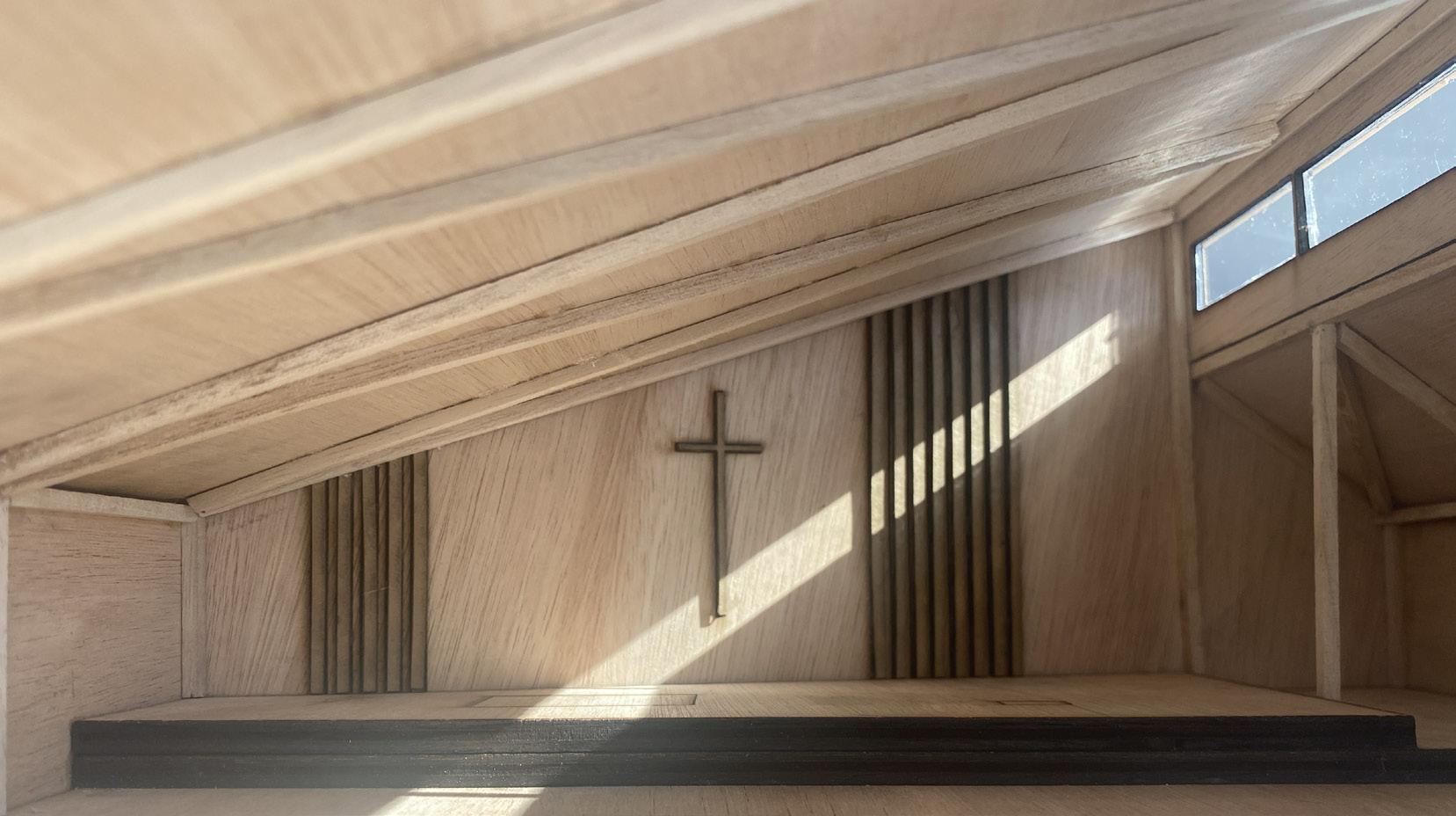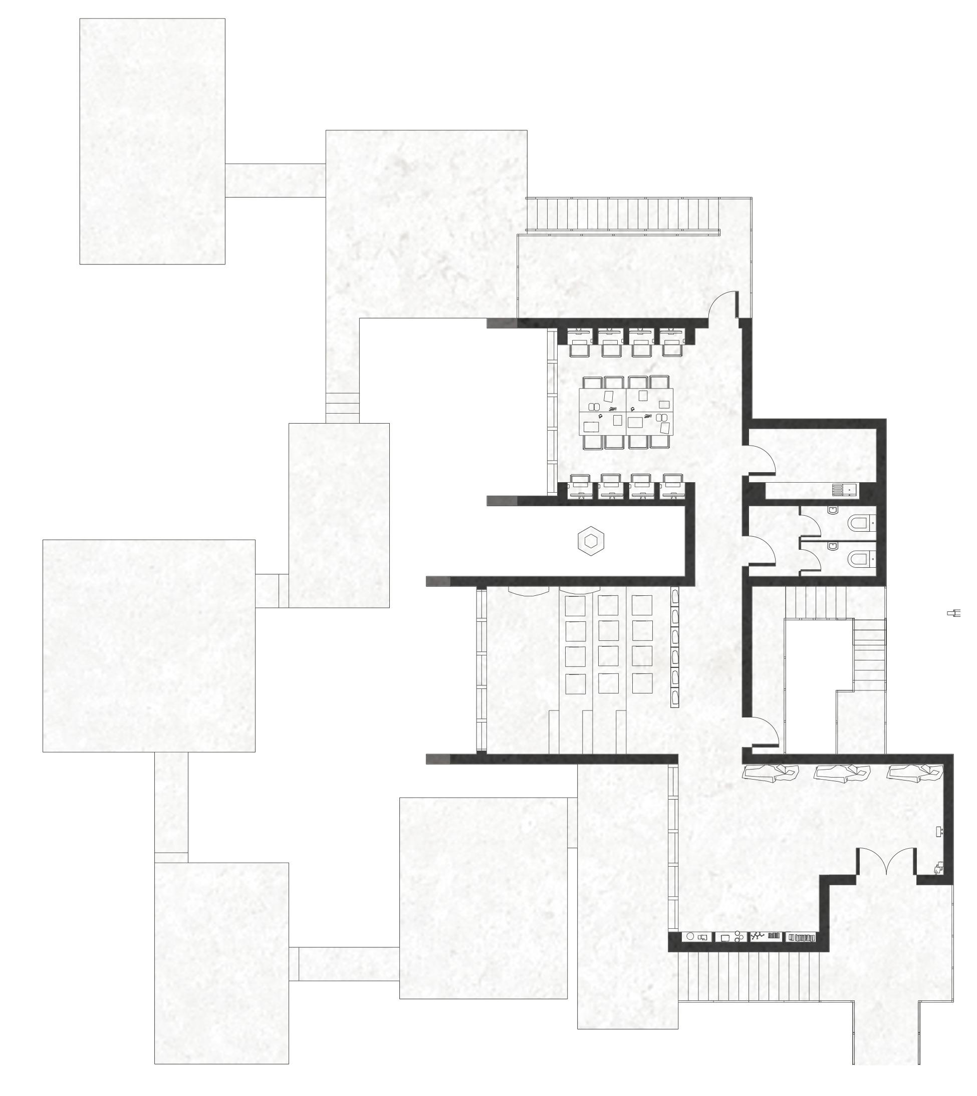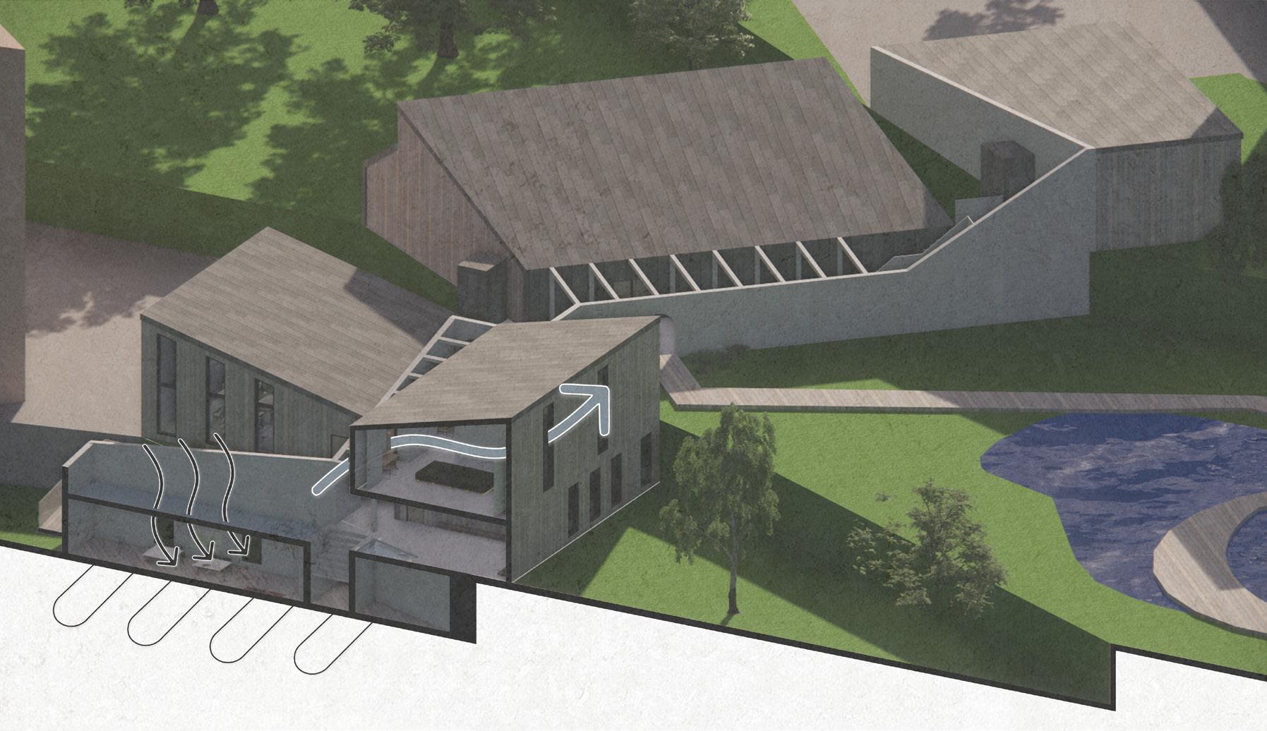 This project is about spirituality connecting life and death. The design for this community centre welcomes all individuals of all abilities and backgrounds to enjoy and gather. Located in Lisbon on a highly topographic site, each contour has a three-meter drop. The focal point of this design is the church. Clad with zinc and timber, the church’s interior exposed beams evoke a welcoming, warming atmosphere for guests. The skylights provide an abundance of natural light, just one way in which this design is sustainable. The site is located close to a graveyard. I wanted to create a spiritual connection between the community centre and the graveyard, therefore a nature trail has been implemented into my design, offering a peaceful and tranquil journey between the two locations, also attracting local wildlife. Meditation was something I thought was important when designing this building, therefore, I implemented the use of biophilic design as much as possible in order to create a highly relaxing space. A continuous wall design connects the rooms on different contours and helps to create flow and continuity within the community centre. The wall guides users around the building and offers solar shading. Sustainability is at the heart of this design, with all materials being sustainable and recycled choices. The meditation pool located on top of the rooms of the lowest contour provides water cooling and collects rainwater. This design is a spiritual journey as there are two entrance points to the building, meaning you can walk through the entire scheme and also directly access the graveyard, delivering a connection between life and death: the juxtaposition of the eternal nature of the graveyard and the connection with the vibrant community center, incorporating elements of spirituality, nature, and the surrounding environemt.