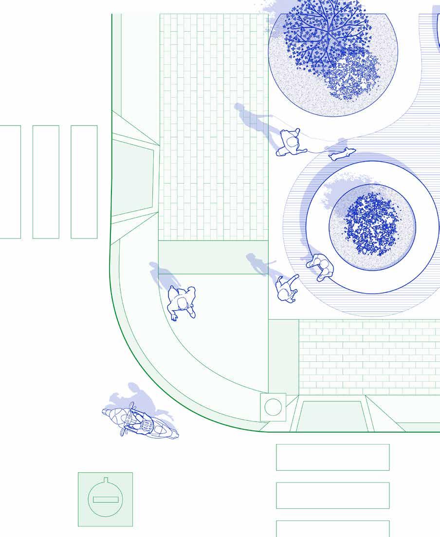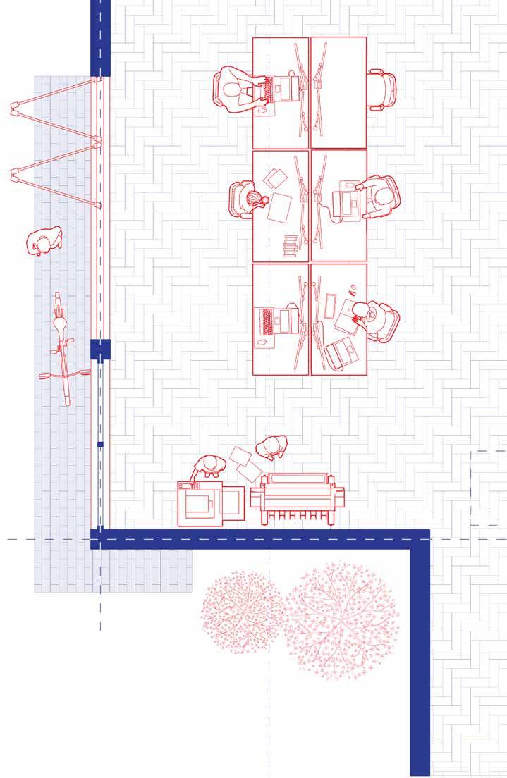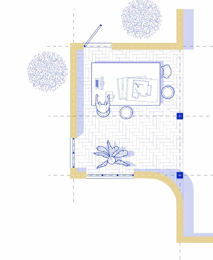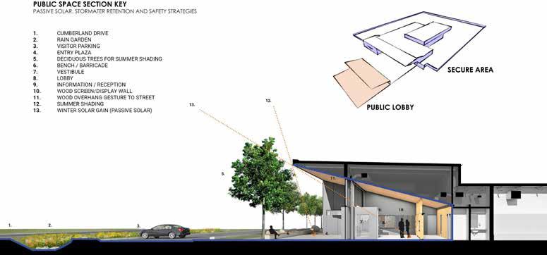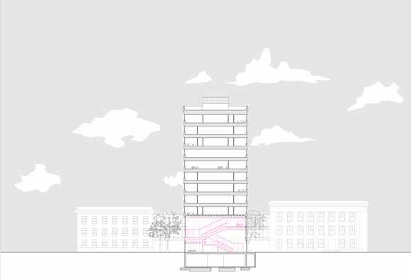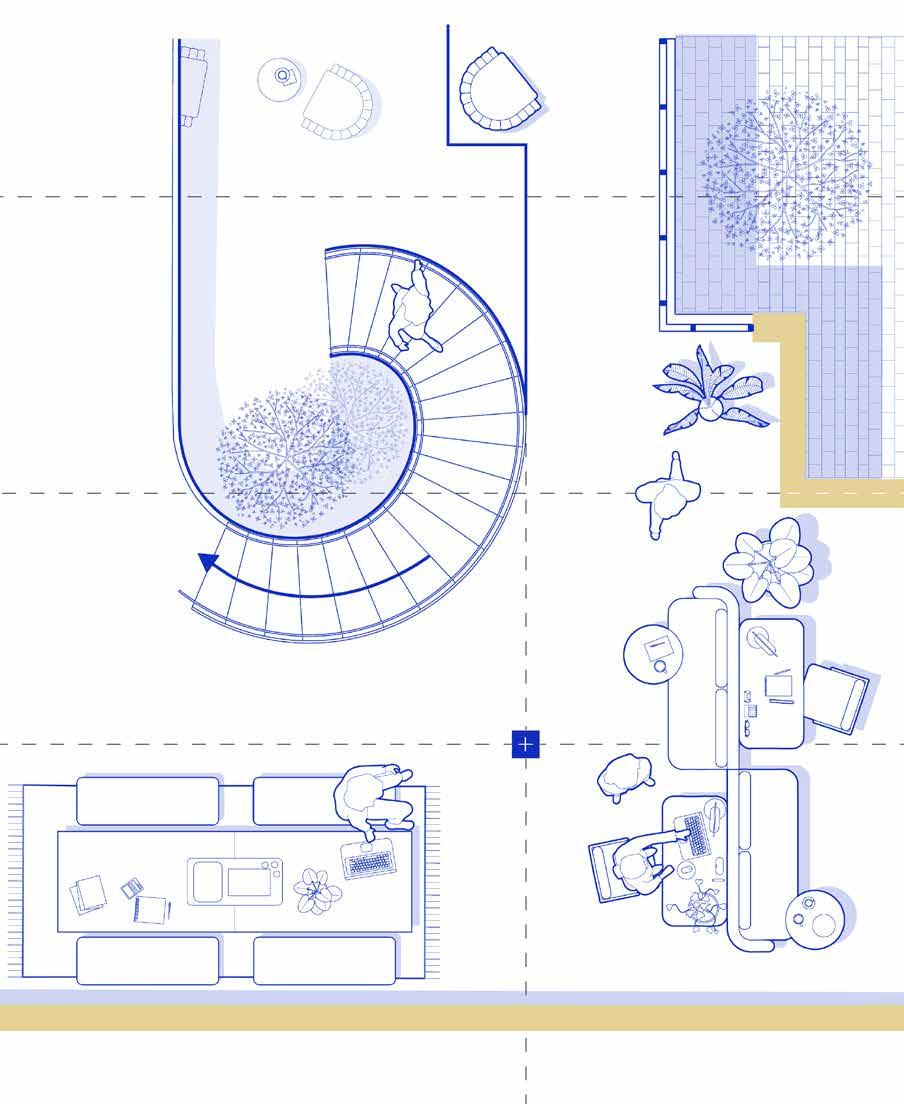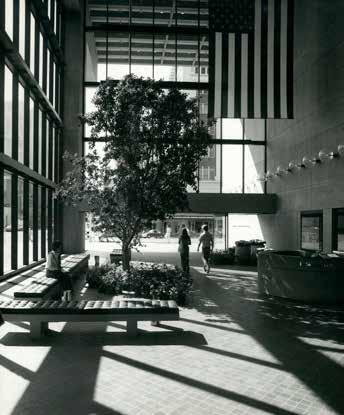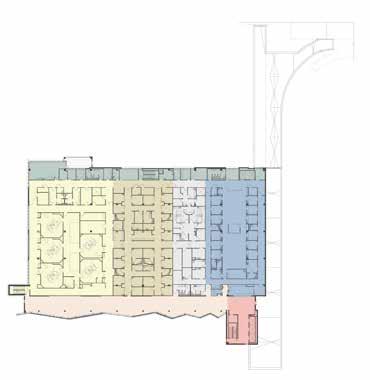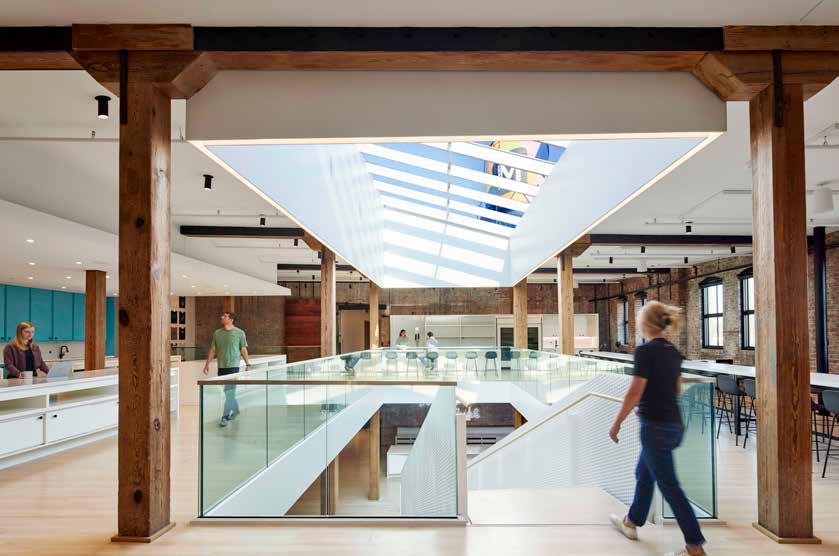 the top floor of the building to the ground floor addresses the “right to light” WELL® standard, outlining that access to natural light is critical for health and well-being due to its effects on visual comfort and other physiological benefits. Purcell credits this plant-covered lightwell implementation as a quick architectural exploration that further integrates biophilia into her final design and tackles the issue of the building’s existing condition of only having windows on the northern and southern faces of the building.