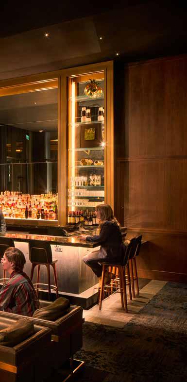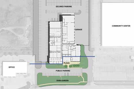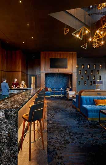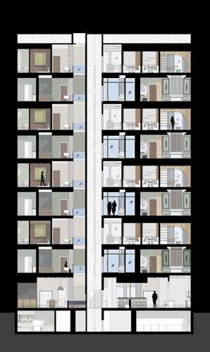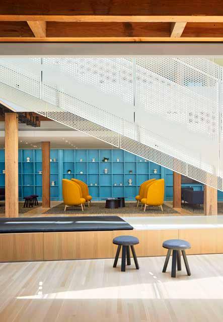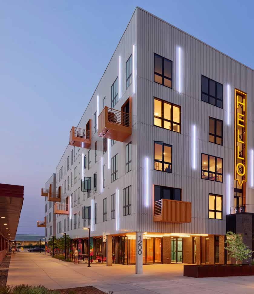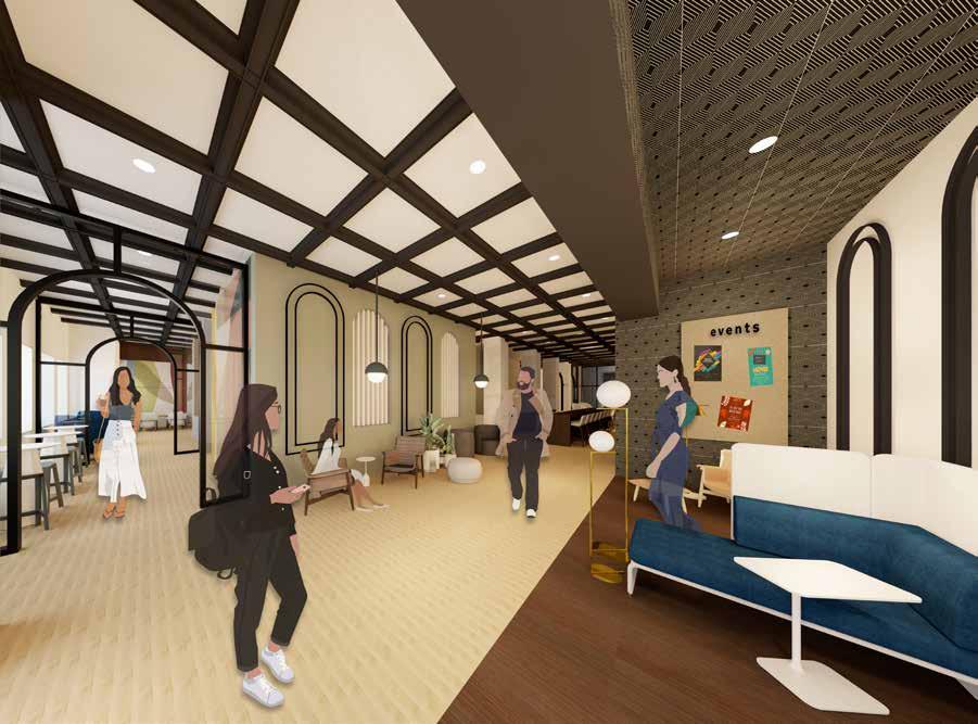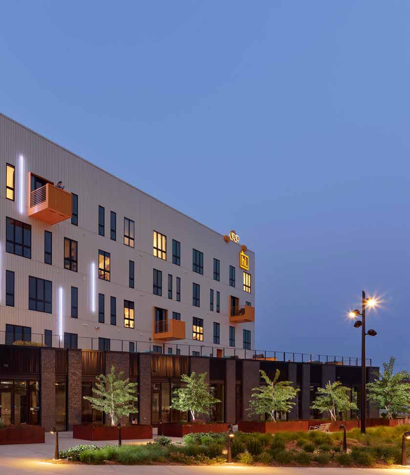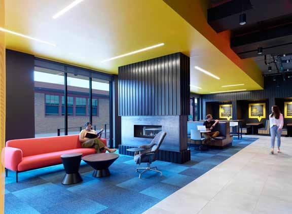 offer coworking spaces and open circulation, with one-bedroom apartments along the eastern and western edges of the building to create a program of extended-stay use. A central lounge area and personal “focus pods” provide guests with a variety of acoustical zones and acts as a barrier between the apartment areas.