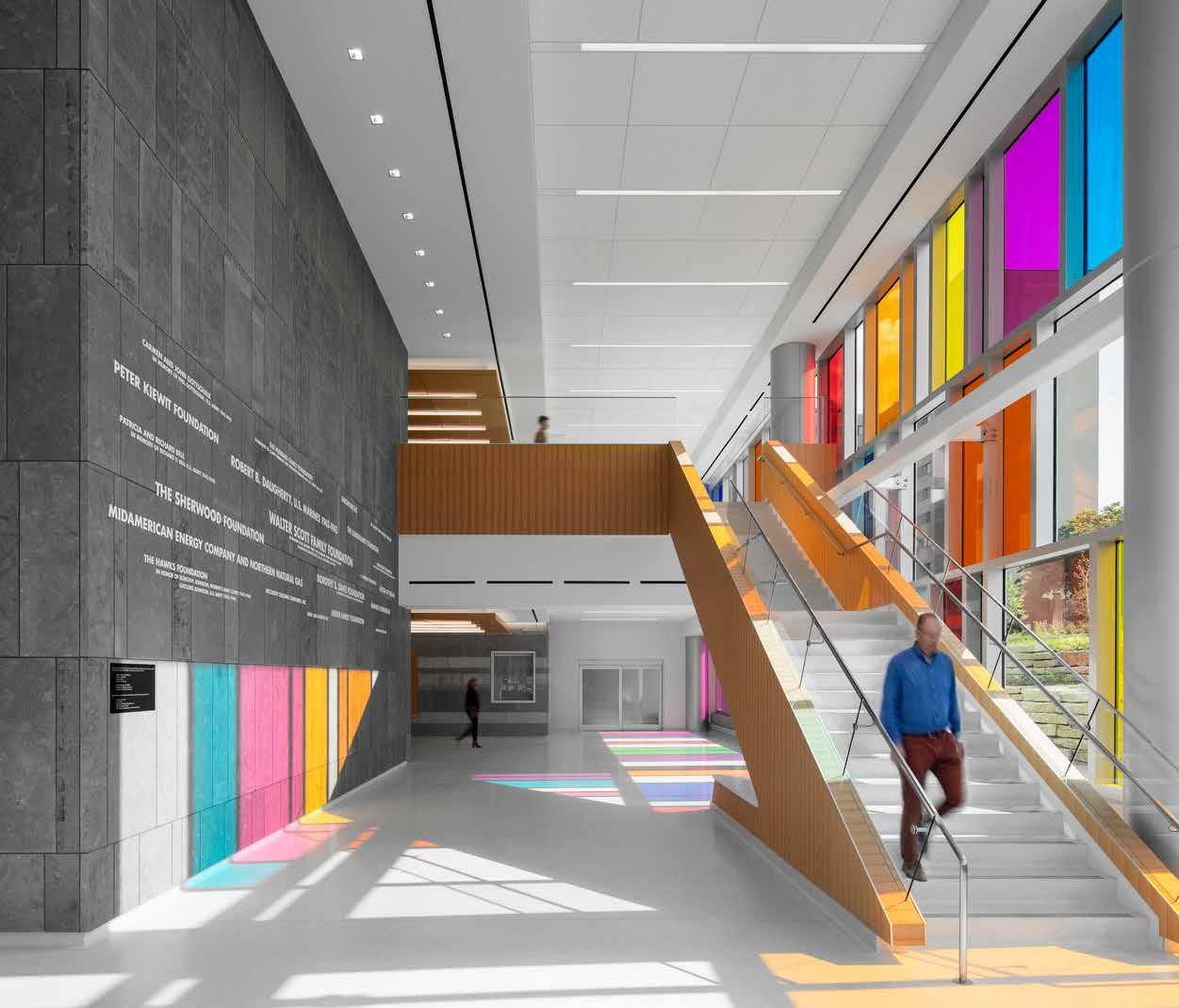 The interior complements the exterior. The exterior of the building features dichroic fins, which are glass elements that produce a shimmering and colorful effect. The interior team wanted to reflect this playful element on the interior, hence the wide variety of color selection. Laura and her team faced the challenge of having to work around the existing lobby space. Their goal was to guide people from the existing entrance to the Hubbard Center.