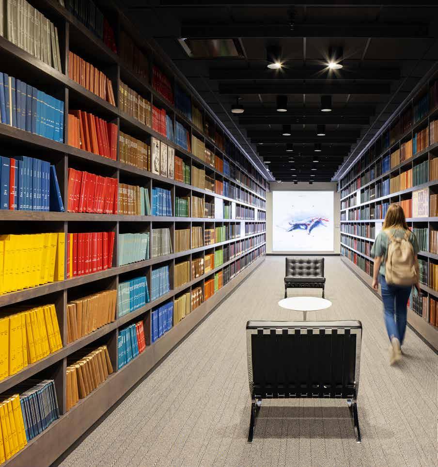 The project itself began with the goal of downsizing the existing library collections to remove outdated, unrelated, and unused titles. In doing this, floor space dedicated to storage could be simultaneously reduced and repurposed. While typical library programming consists of extensive book stack allocation, the HDR redesign aimed to maximize space centered around focus and collaboration. DeRoin explains that a key feature of the design was the joining
