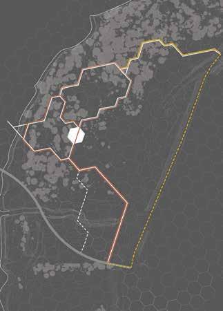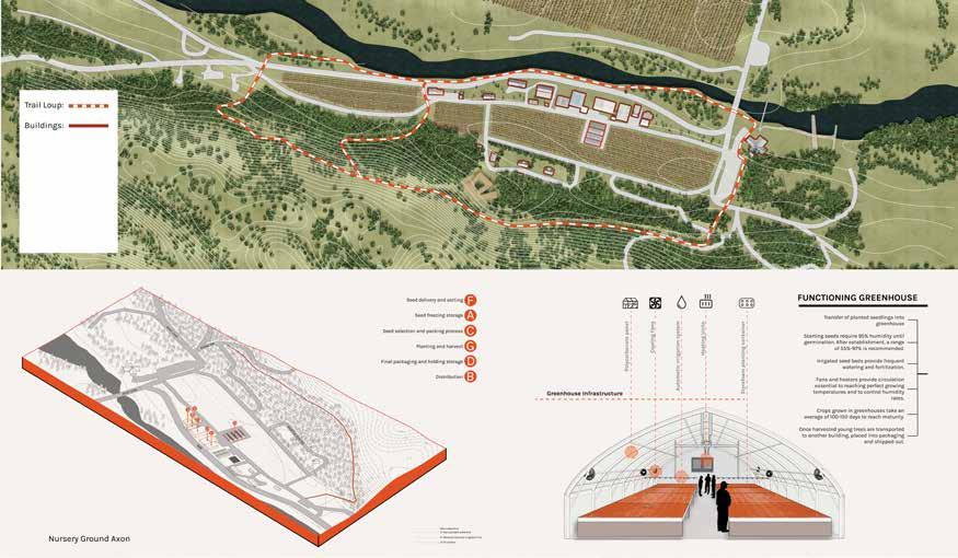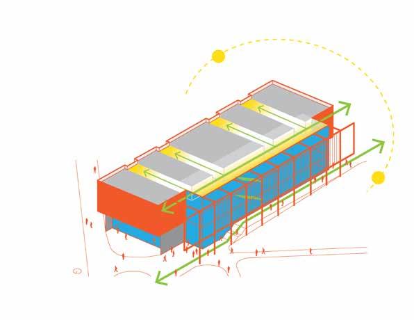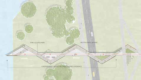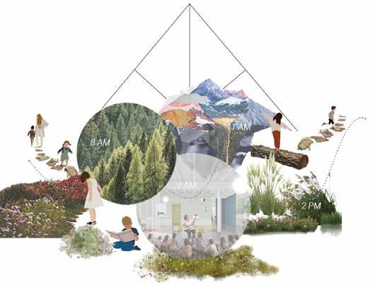distinct outdoor environment. Students are guided on a journey through different “outdoor” environments as they circulate the classroom throughout the day for different activities, promoting engagement and conscious presence. Katie described her use of programmatic diagrams to iterate different adjacency arrangements to create an interior that can be understood by the elementary students while promoting safety and visibility. Floor and wall material changes, as well as furniture arrangement, create the boundaries between each space and resemble the different environments of the interior. The project’s material selection resembles a natural environment, while also avoiding harmful products that have chemicals that can’t be utilized indoors and that are environmentally conscious. The project brief describes the site to be on a school property that is in a lower-income area, which commonly lacks accessibility to nature and parks. With this in mind, Katie’s concept was to provide a classroom setting that allows the children to experience nature and benefit from the stress reduction that a natural environment provides. Natural sunlight was important