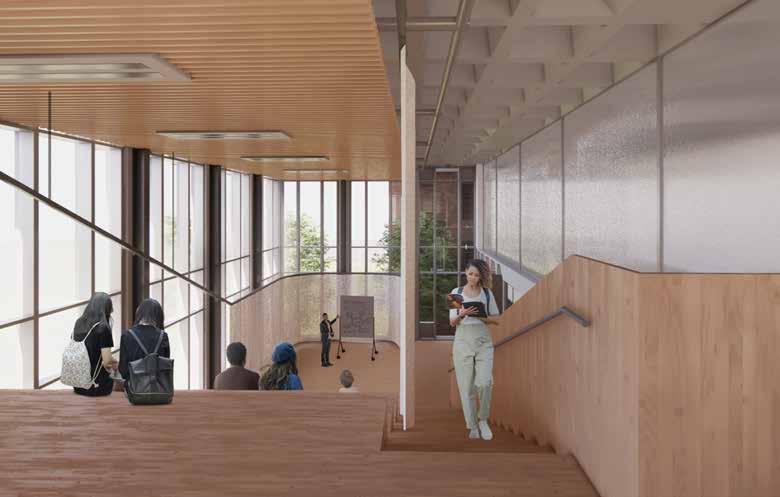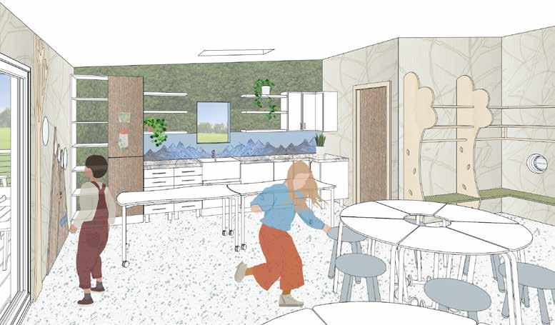 school project. At first, Katie was skeptical about submitting, but through the encouragement and interest of her internship, she took a chance and submitted the project. This was her interior design studio’s first project of her third year, fall semester: a mega studio of her entire interior design class of over 30 students. The studio was led by Kendra Ordia and by Emily Drummy, who was Katie’s immediate instructor. The studio was taught in person at the College of Architecture and students worked on individual projects throughout that semester, but shared ideas and questions with fellow students. This award-winning project features a biophilic classroom design for elementary students in Lincoln, Nebraska. Katie’s design blurs the threshold between interior and exterior environments, providing a safe space for children to reduce stress and improve mental health by being connected to a natural environment.
