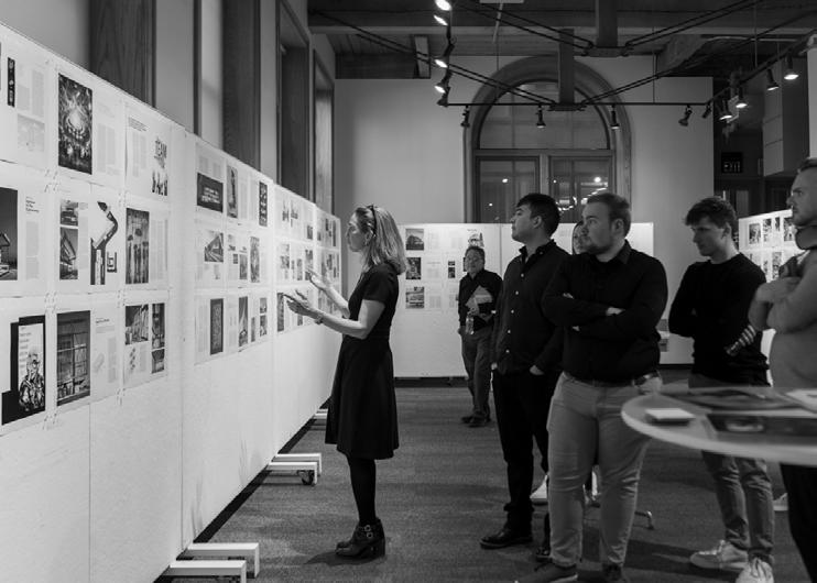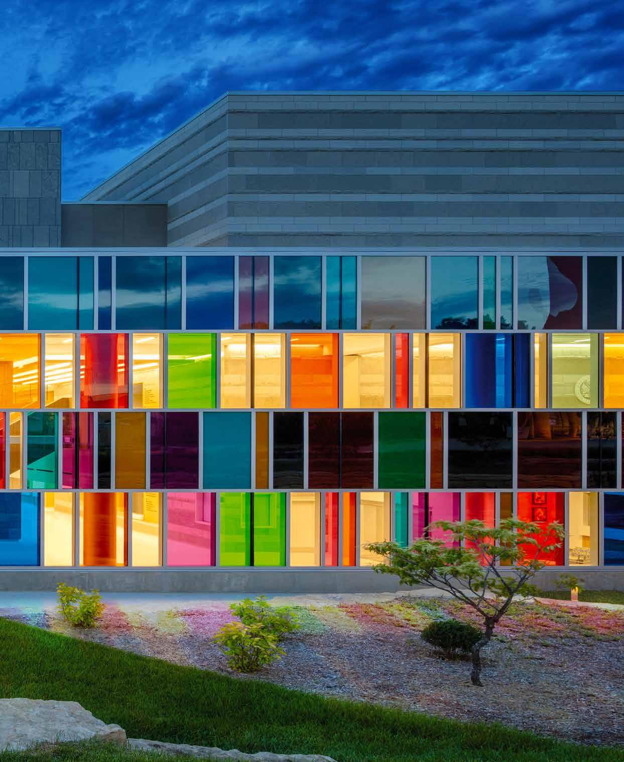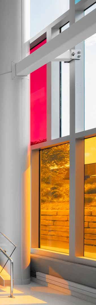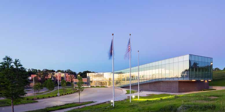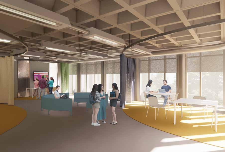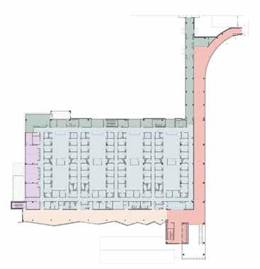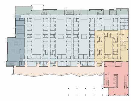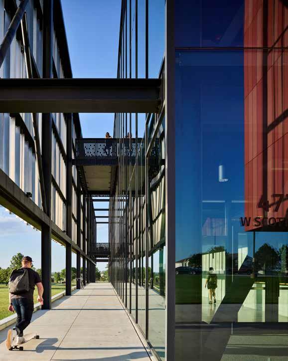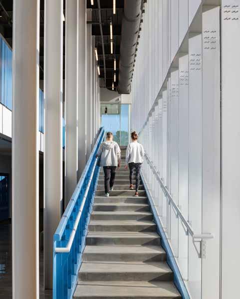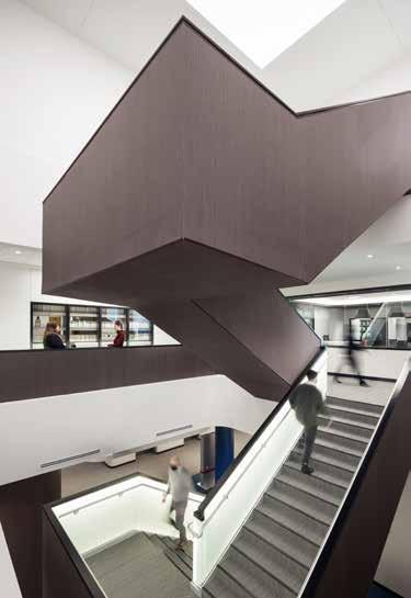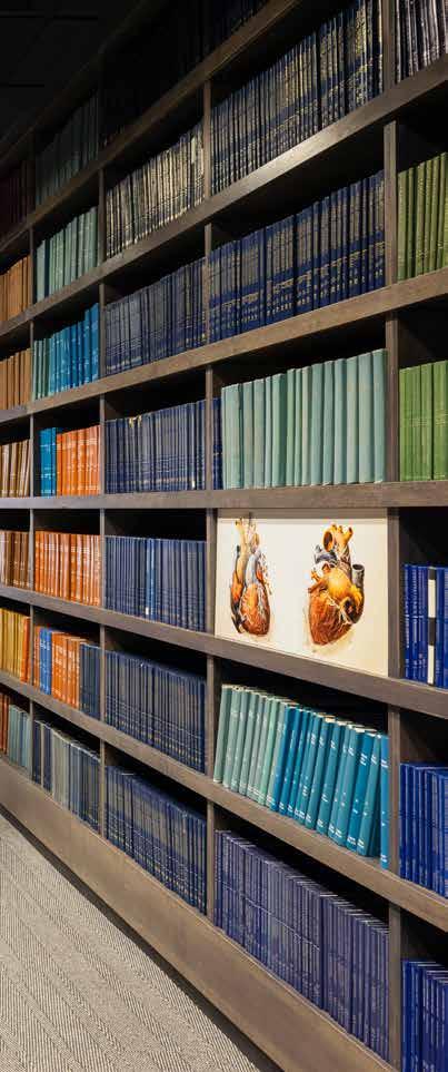 of collection storage and circulation space via the reutilization of a central circulation corridor. In doing this, the library showcases the existing physical collections without the need for separate storage areas. These changes increased both floor-plate efficiency and available square footage for study rooms and other collaboration spaces. Furthermore, the removal of book stacks within the space allowed for the introduction of natural light. As archived books typically cannot be exposed to UV light, the reorganization and reduction of the collection provided ample opportunities for the removal of precast panels which were subsequently replaced with curtain wall glazing. However, DeRoin notes that a large part of the success of the “circulation spine” is due to the dedication and investment of the UNMC team. Working collaboratively with HDR, the client sourced archival medical imagery to create engaging interior graphics. The client also facilitated organization and book placement throughout the circulation corridor as a means of finalizing the vision proposed by DeRoin and his team. Another focus of the design proposal was prioritizing the grand stair which connects the various levels of the library. By encouraging circulation through the stair, the goal for the space was to become much more engaged and activated by its occupants. This was achieved by