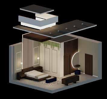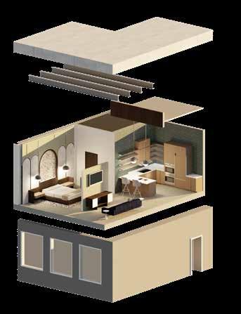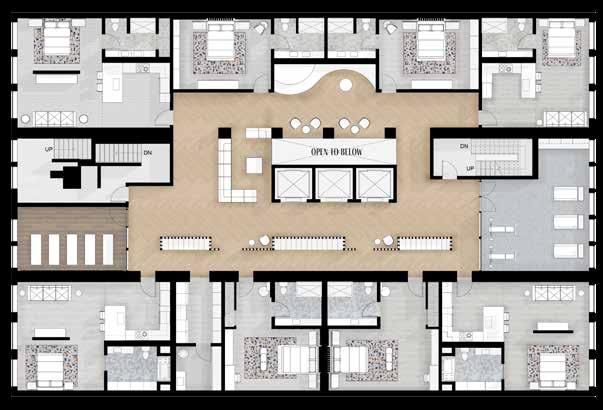 The activation levels are more focused on guests intending to stay for a shorter period. The central core of these floors offers a grand lounge space that creates a buffer between the eastern and western sides of the floor, where studios and “sleeping pods” are located. A yoga studio and gym, respectively on the southern and northern ends of the floor, introduce elements of movement to support the physical well-being of guests. Both the studios and the one-bedroom apartments on the different floors provide guests with ample living space, a full-service kitchen, a full bathroom, and access to natural light.
