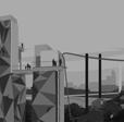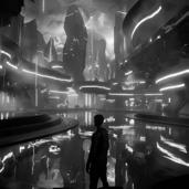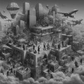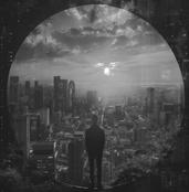 Input: /Imagine: Silhouette overlooking an urban landscape that has negative effects of traditional design, emphasizing environmental harm, social injustice, and community displacement caused by gentrification. Show the contrast between current design practices and the need for sustainable, socially responsible alternatives, conveying skepticism about the industry’s willingness to change its profit-driven mindset.