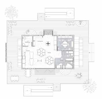 for creating the biophilic atmosphere, which was incorporated through the use of adequate windows, and which also provided views to the exterior landscape, further strengthening the children’s connection to nature. Organic forms with curved corners and surfaces were expressed throughout the design, such as portal windows, circular tables, and natural edges that further blurred the boundary to the exterior. A large wraparound deck extends the classroom past the shell of the interior, which can be utilized as work zones or play zones.