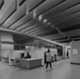 The ground floor offers communal space and provides visitors with coworking areas. For the eating area, Purcell opted for a food hall in place of a restaurant, arguing that restaurants are too formal in function whereas a food hall provides a more casual atmosphere. An integrated market area provides guests with convenience while allowing for a greater source of income for the hotel and works to bring the city of Boston into the building. Areas of coworking and flexible space create community-centered programs that invite guests, locals, and tourists inside to experience the building. Refreshing materials such as genoa oak wooden floors, colorful patterned wallpaper, and elements of plant integration further enhance the informal and welcoming atmosphere of the ground floor.