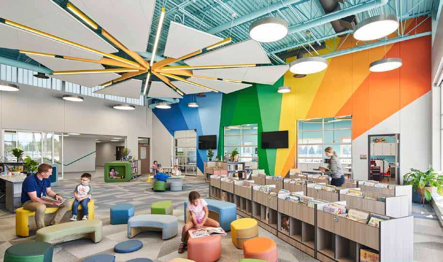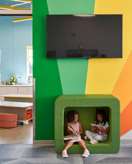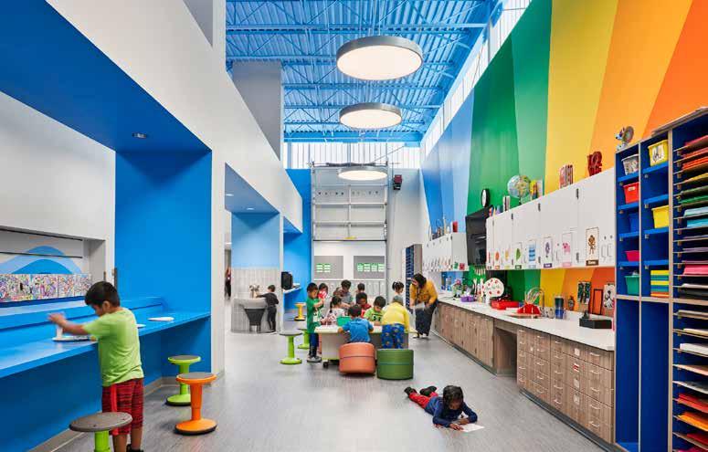 The color palette and material selection create a sense of place within a seemingly large area for young children, but also creates an environment that excites these young minds as they enter the space, creating a desire to go to school and expand their knowledge. Collaboration with administration played a pivotal role in shaping these spaces. “We worked very closely with admin on what they wanted these spaces to be,” adds Smith. “They wanted spaces to be bright and colorful to get those little kids excited for school.”